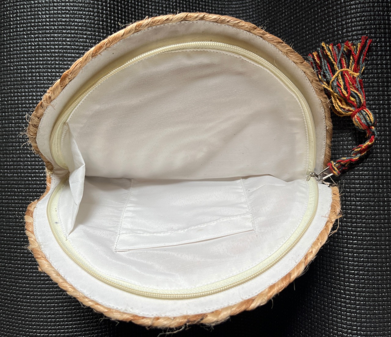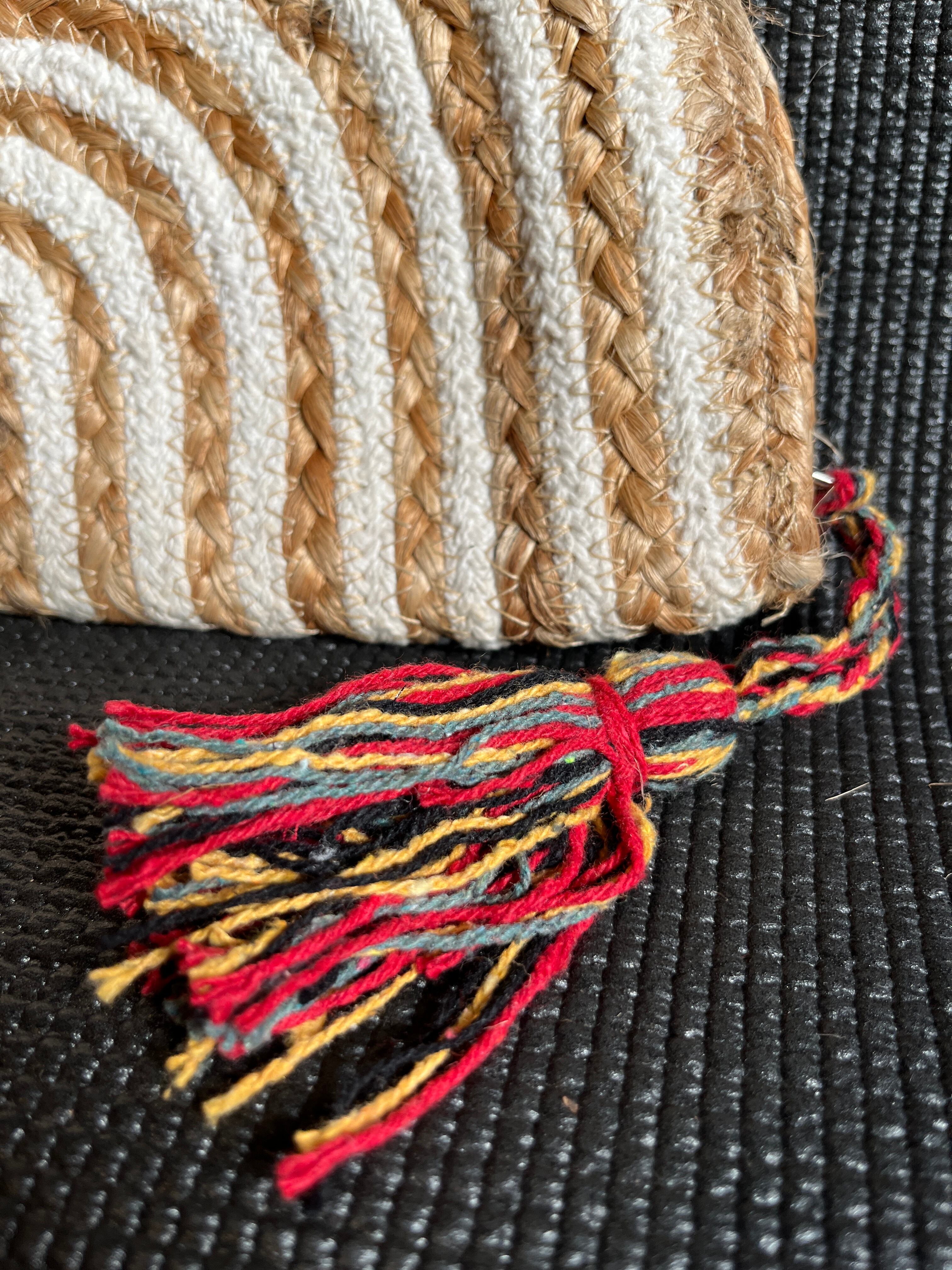 インドのラジャスターン州の、ナチュラル素材のヘンプとコットンのボーダークラッチバッグ。