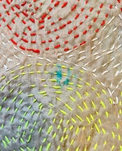 ・インドの女性たちが、1針1針手縫いで刺繍しており、真っ直ぐには縫われておらず曲がったり、寄れていたり、糸が途中で切れているものなどもあります。