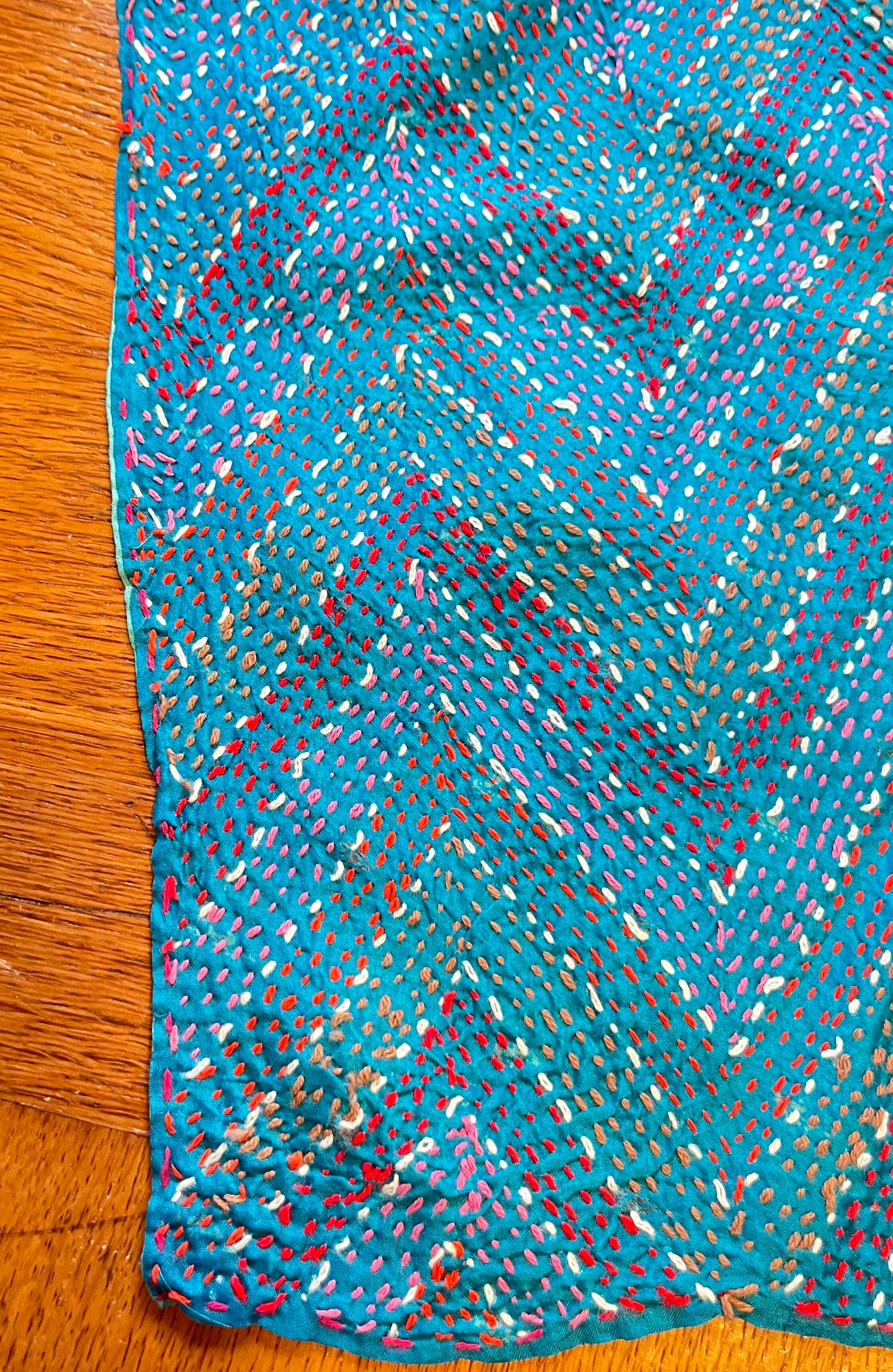 オールドサリーならではの独特の色味と、1針1針手仕事で刺している刺繍で、大変丈夫な布となっています。ストールやマルチカバー(テーブルクロスやベッドカバーなど)以外にも、カバンやお洋服の生地としても使っていただけます。