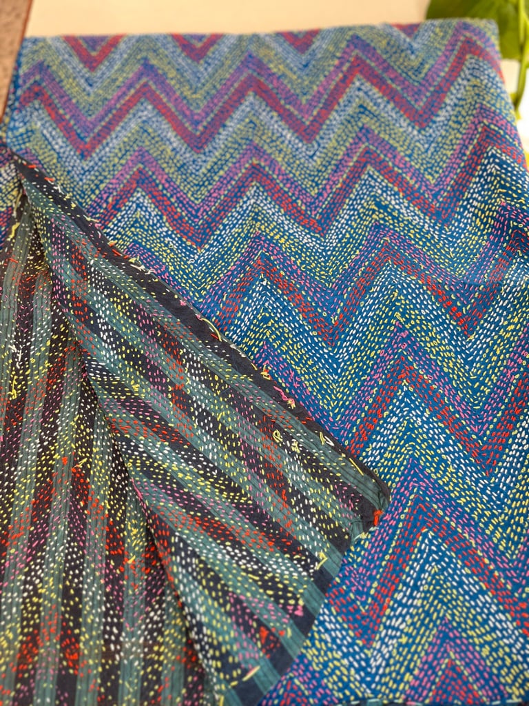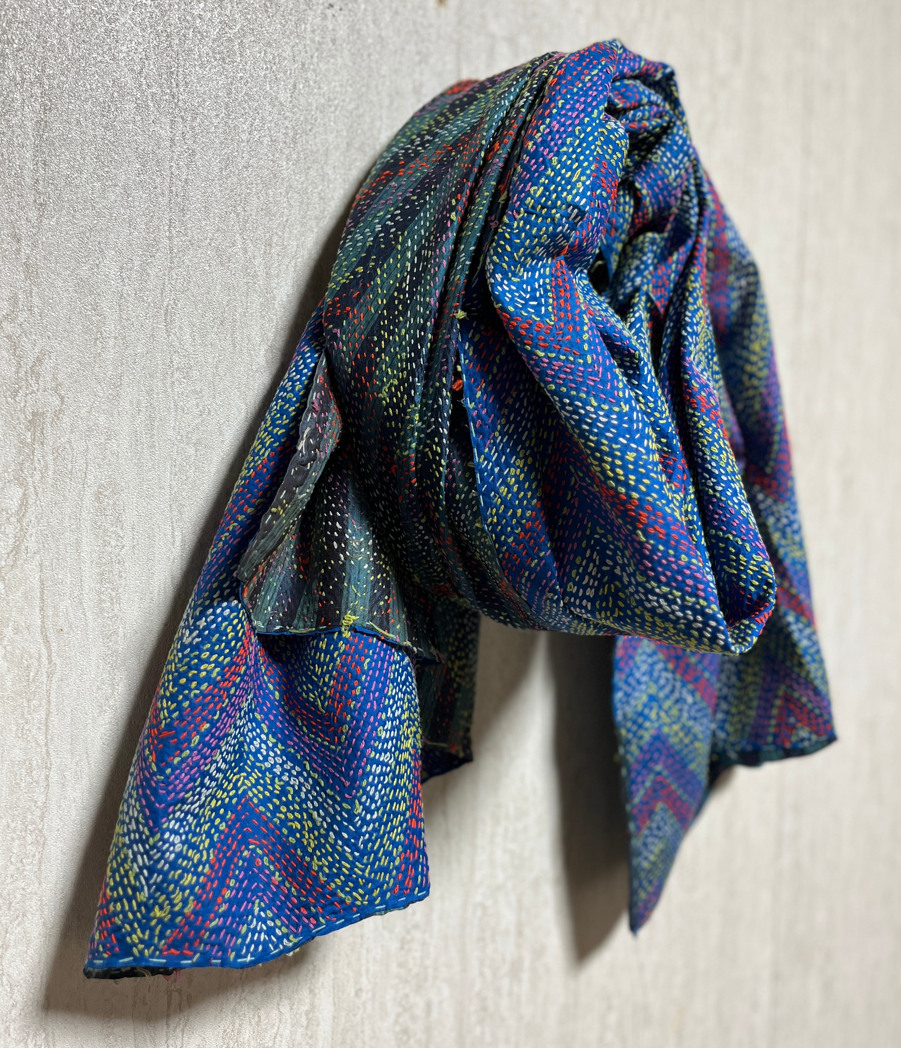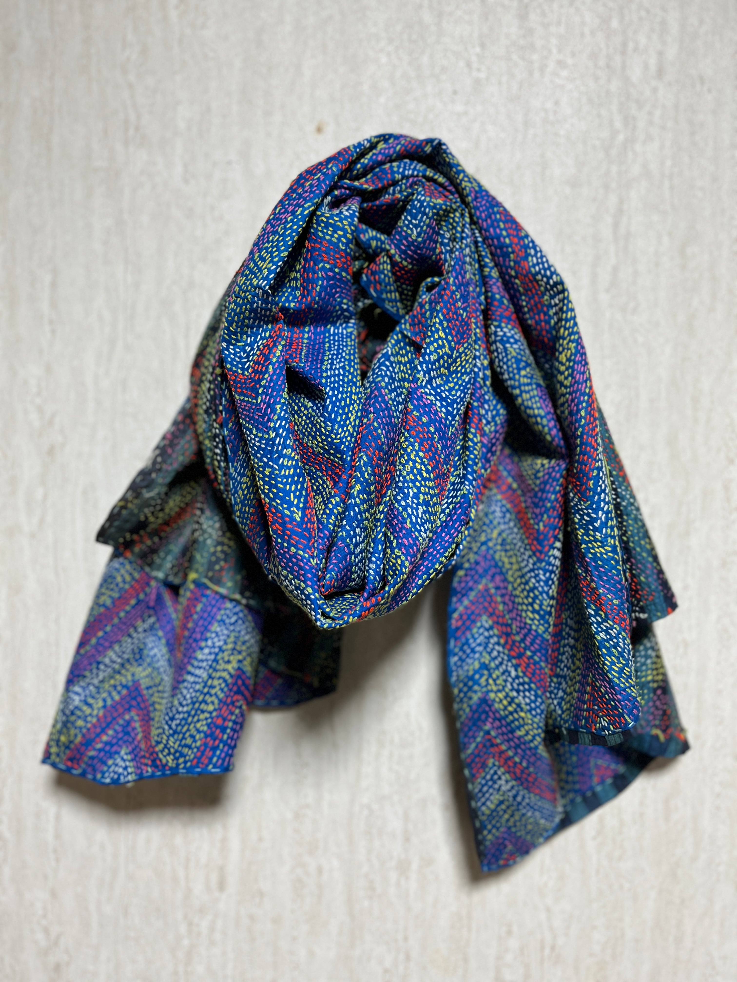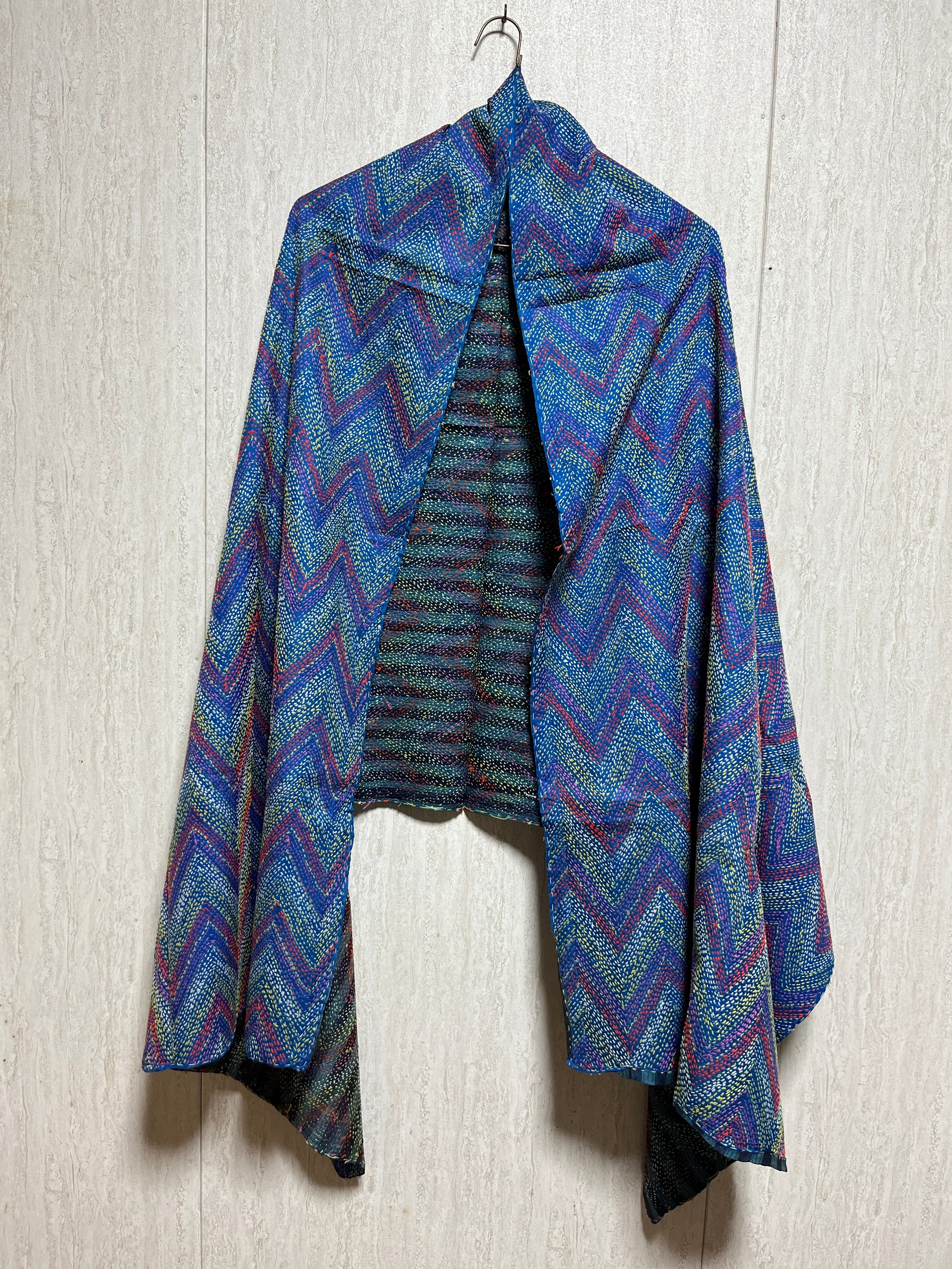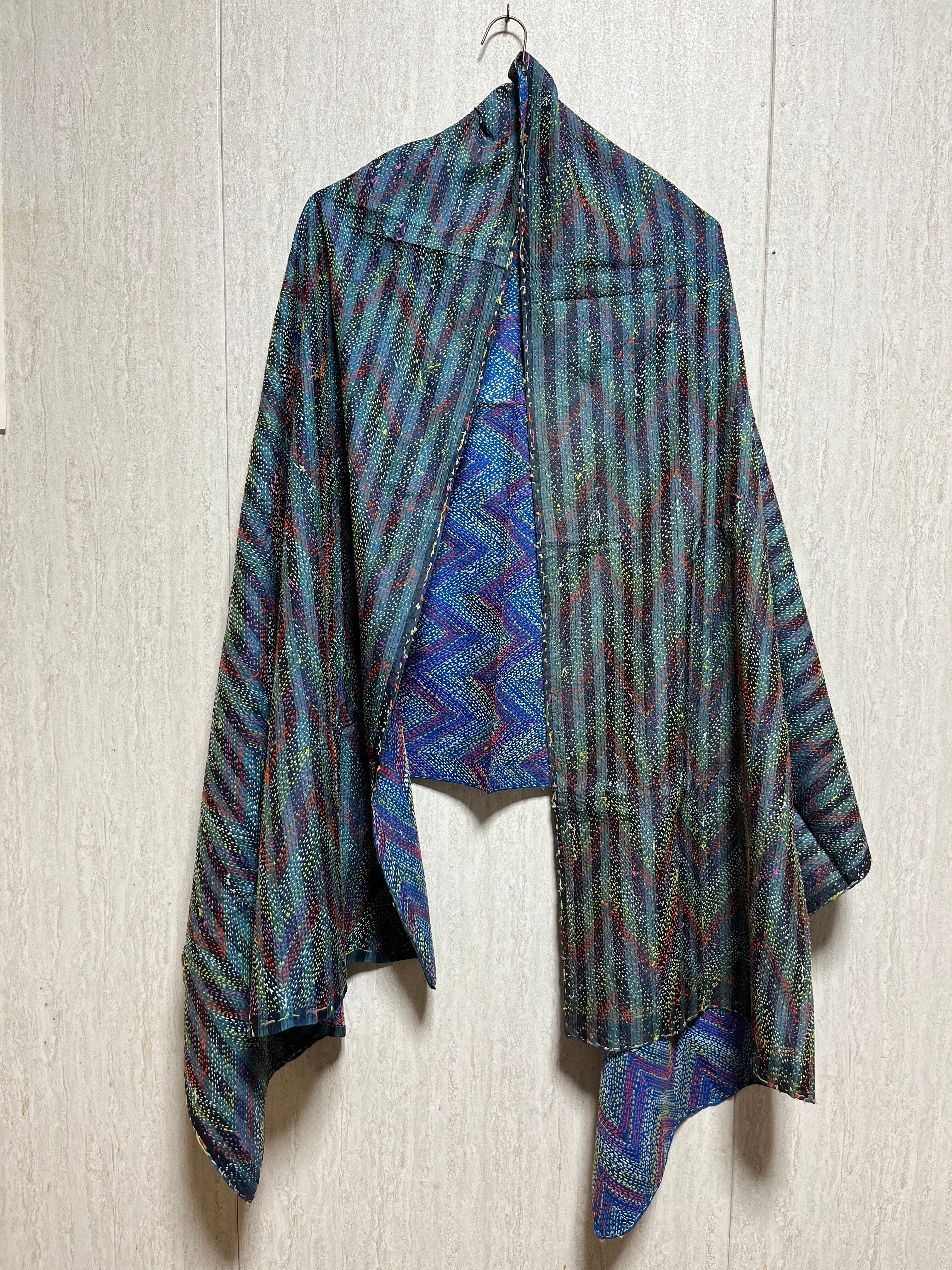【インド】オールドサリーのカンタ刺繍リバーシブルストール&マルチカバー(国内送料無料)