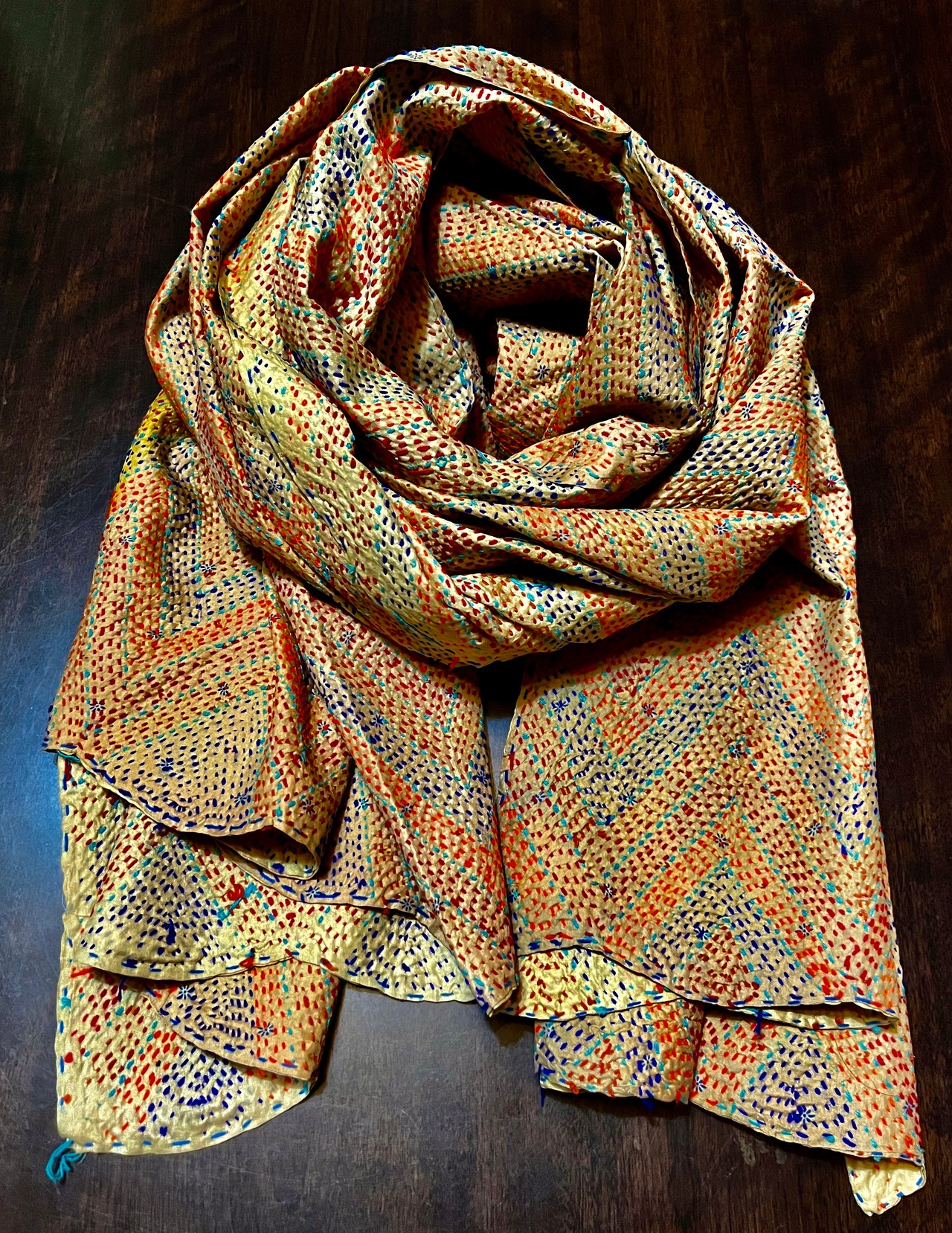 オールドサリーならではの独特の色味と、1針1針手仕事で刺している刺繍で、大変丈夫な布となっています。ストールやマルチカバー(テーブルクロスやベッドカバーなど)以外にも、カバンやお洋服の生地としても使っていただけます。