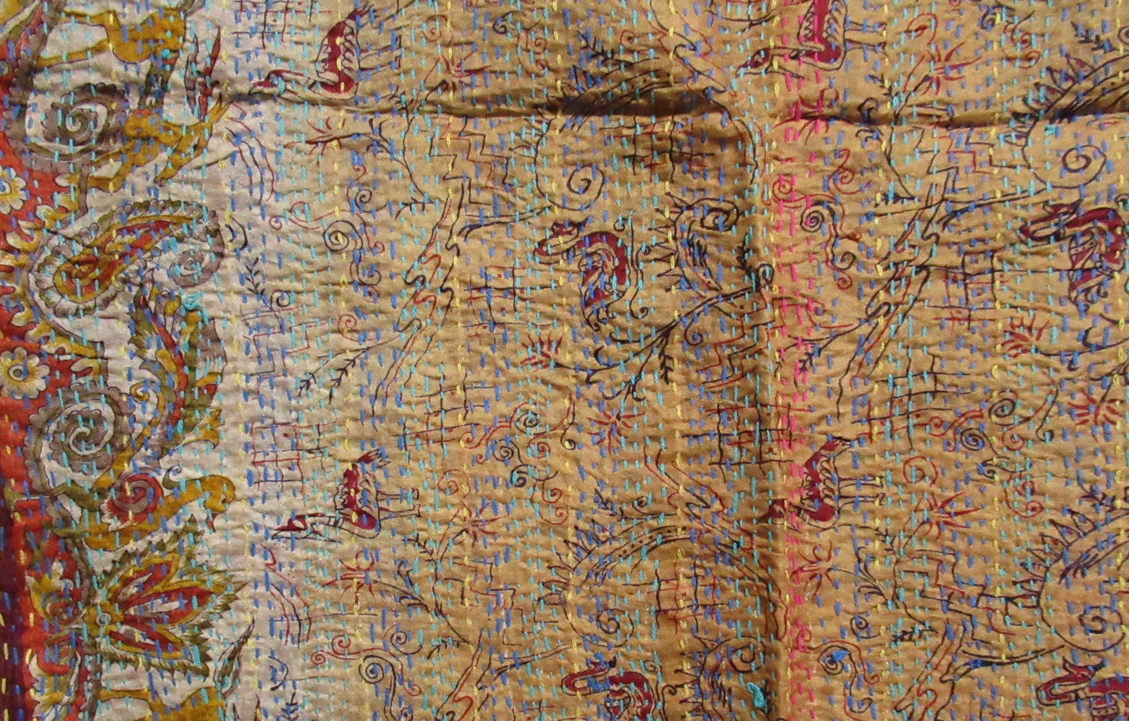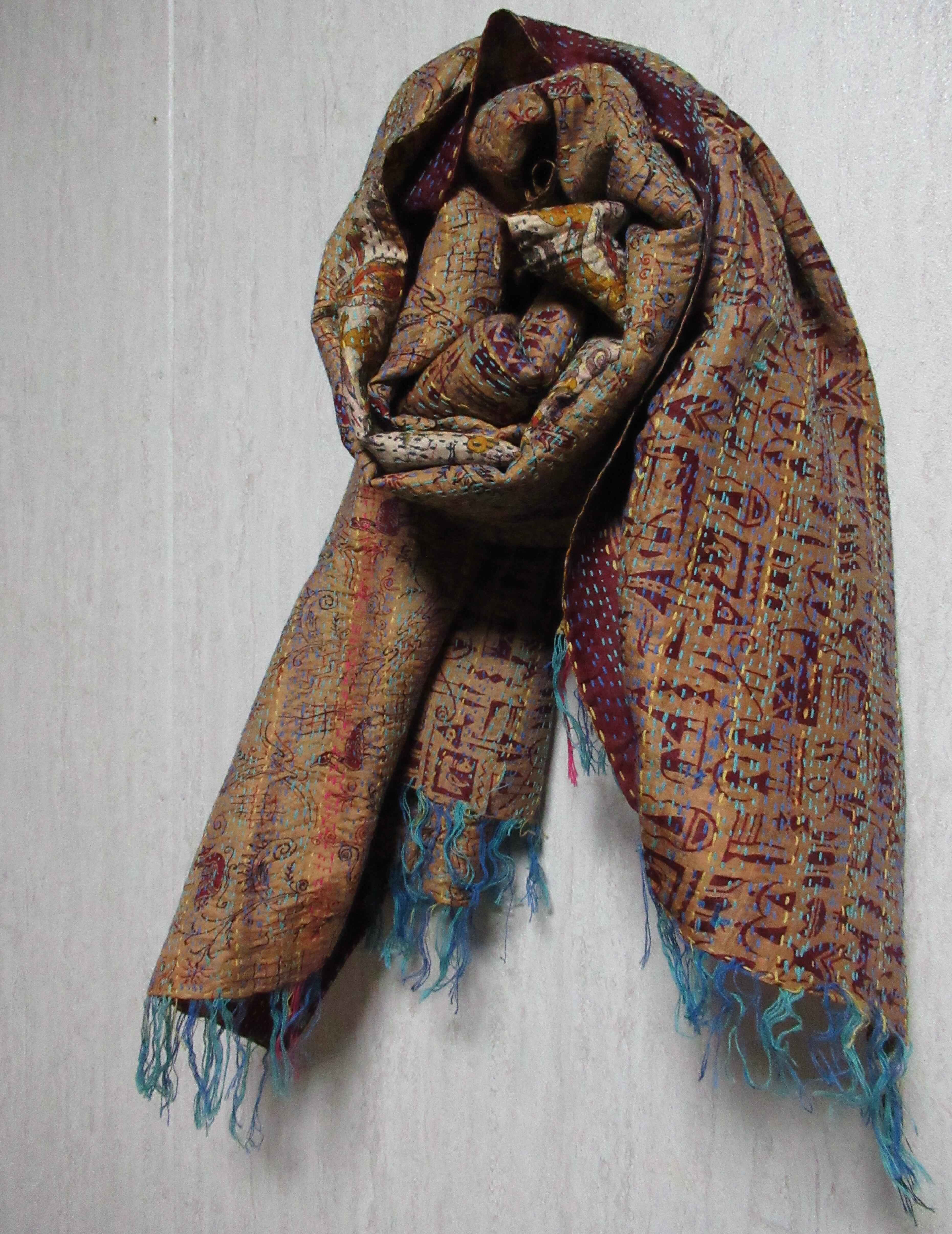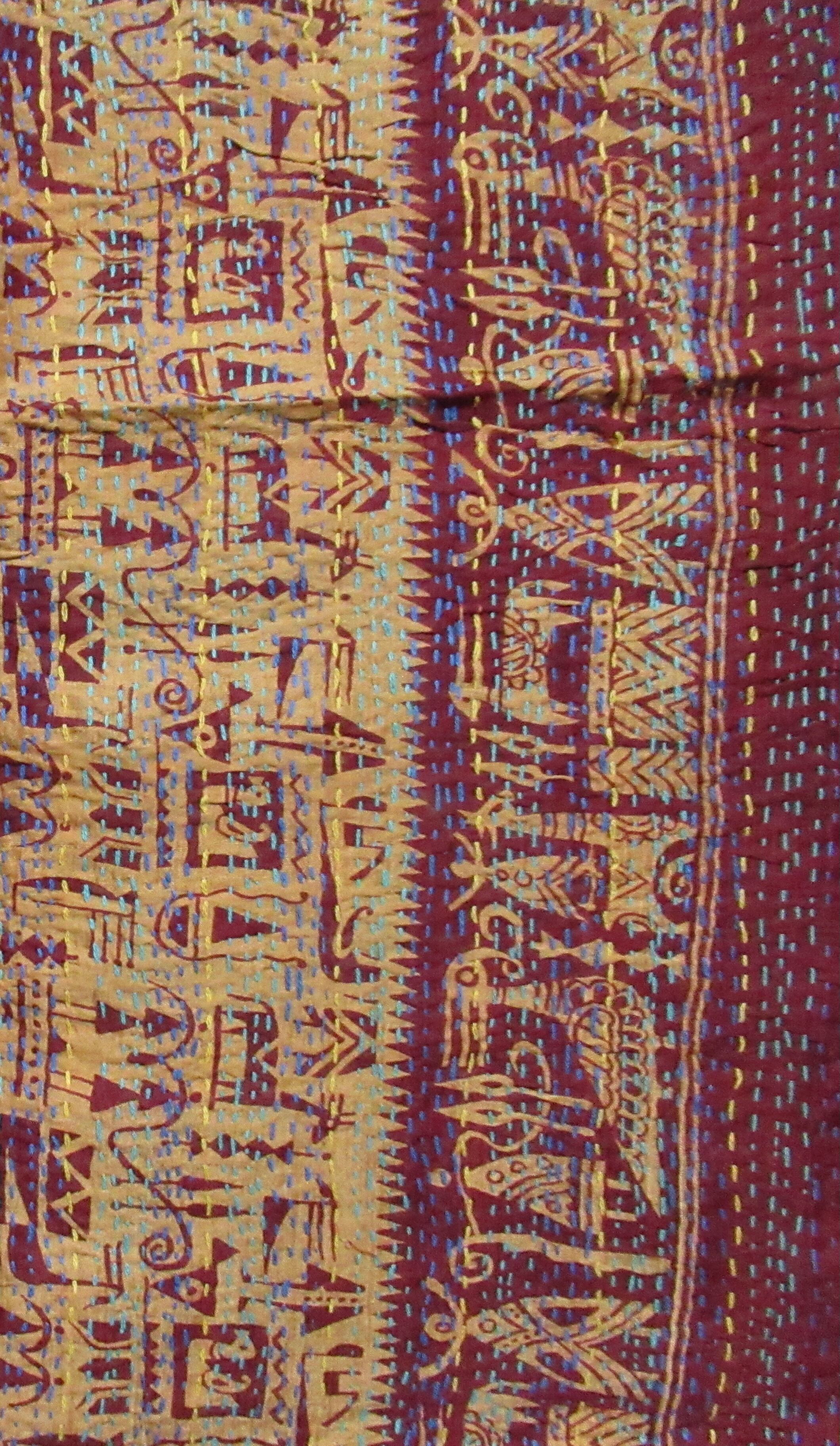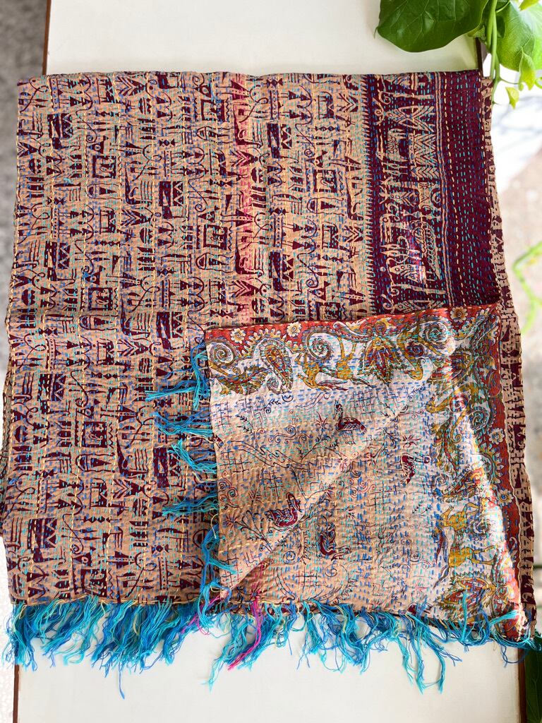 【インド】オールドサリーのカンタ刺繍リバーシブルストール&マルチカバー(国内送料無料)