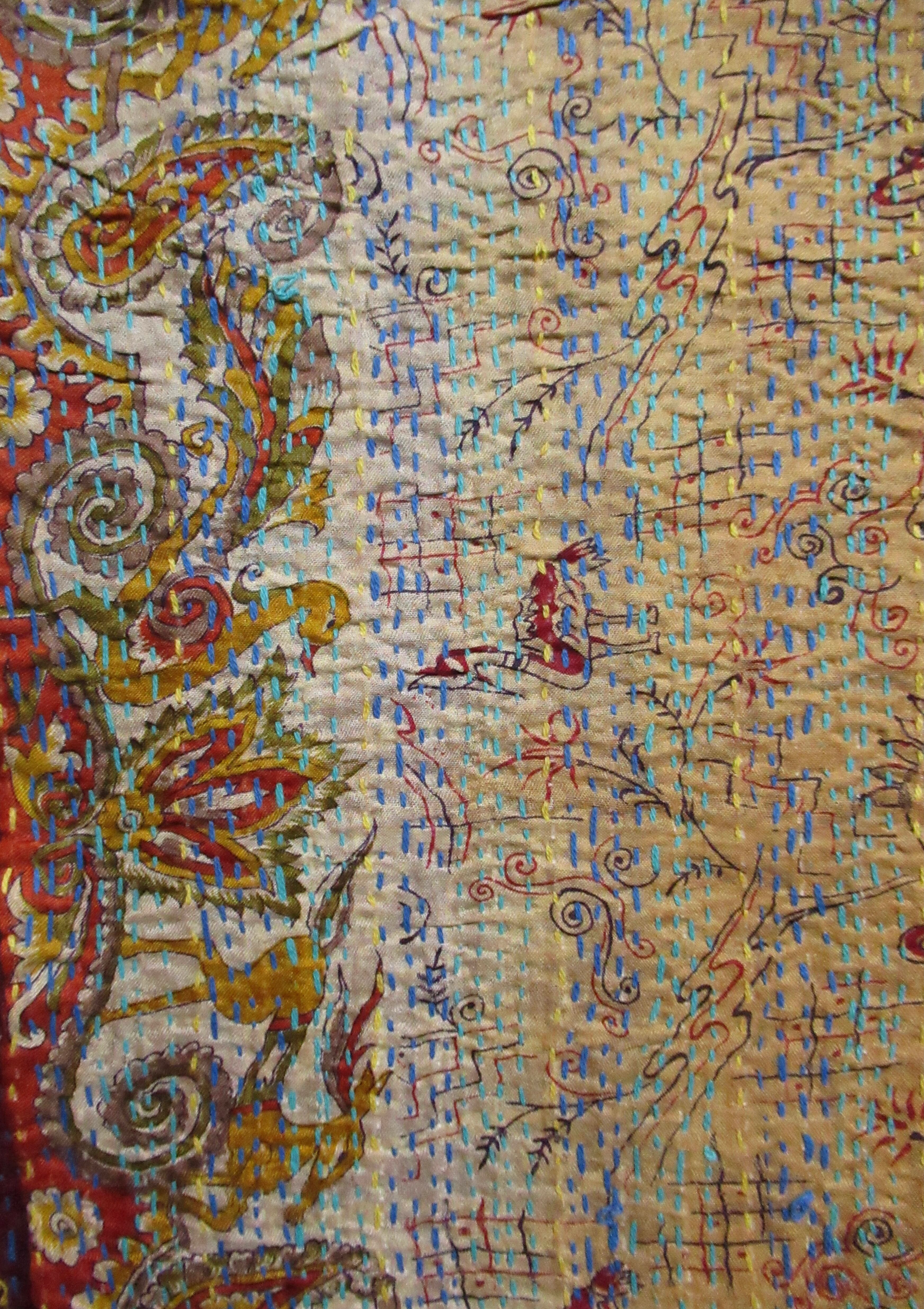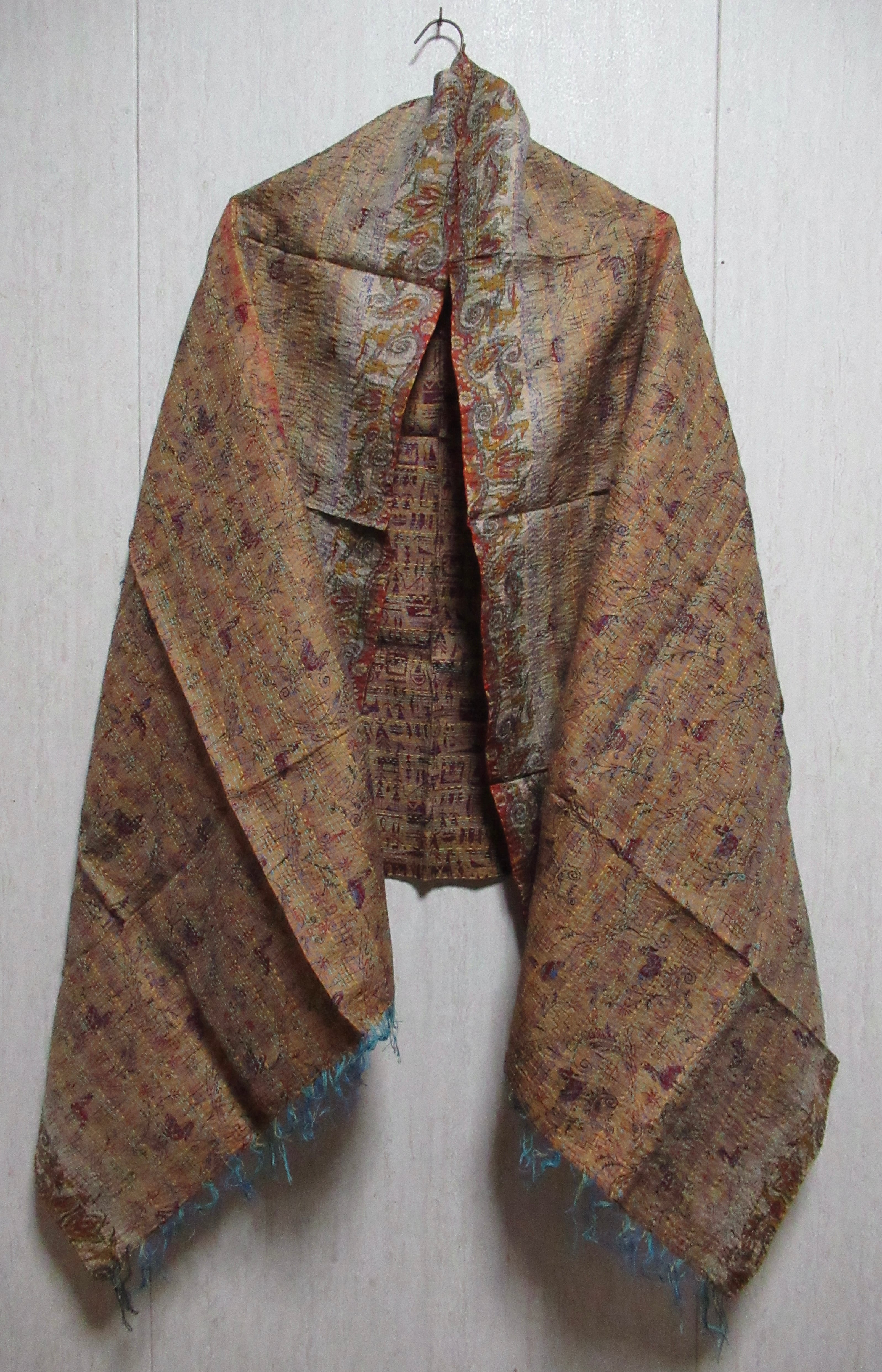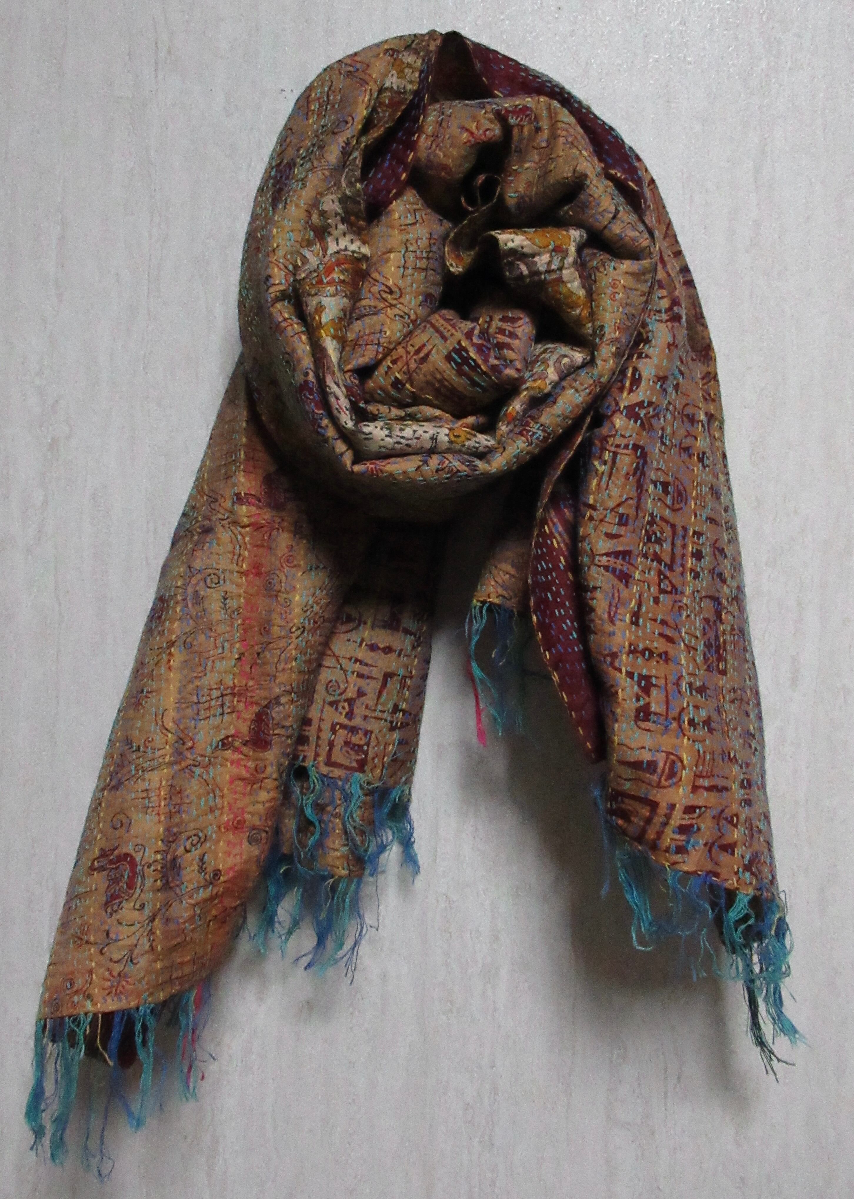 オールドサリーならではの独特の色味と、1針1針手仕事で刺している刺繍で、大変丈夫な布となっています。ストールやマルチカバー(テーブルクロスやベッドカバーなど)以外にも、カバンやお洋服の生地としても使っていただけます。