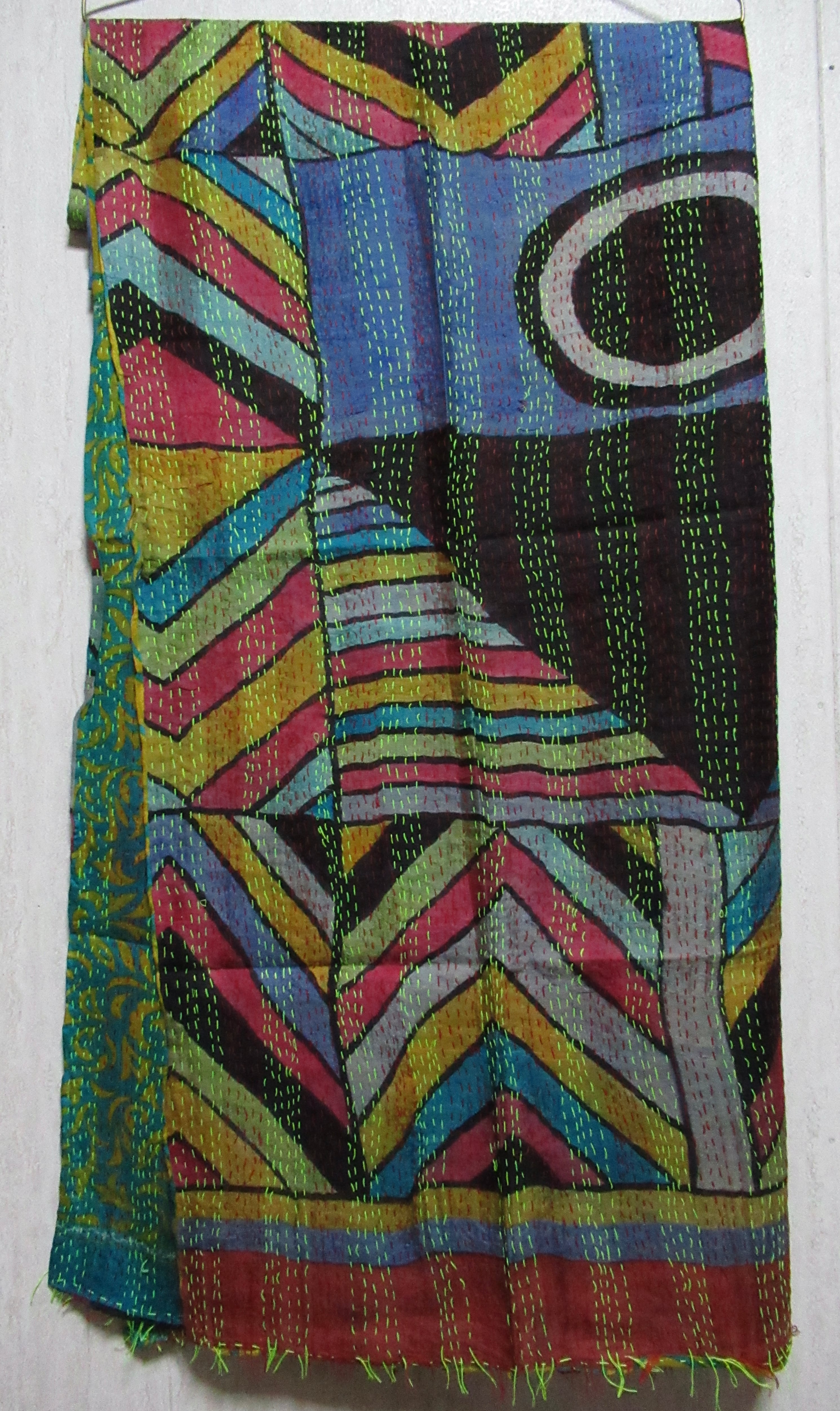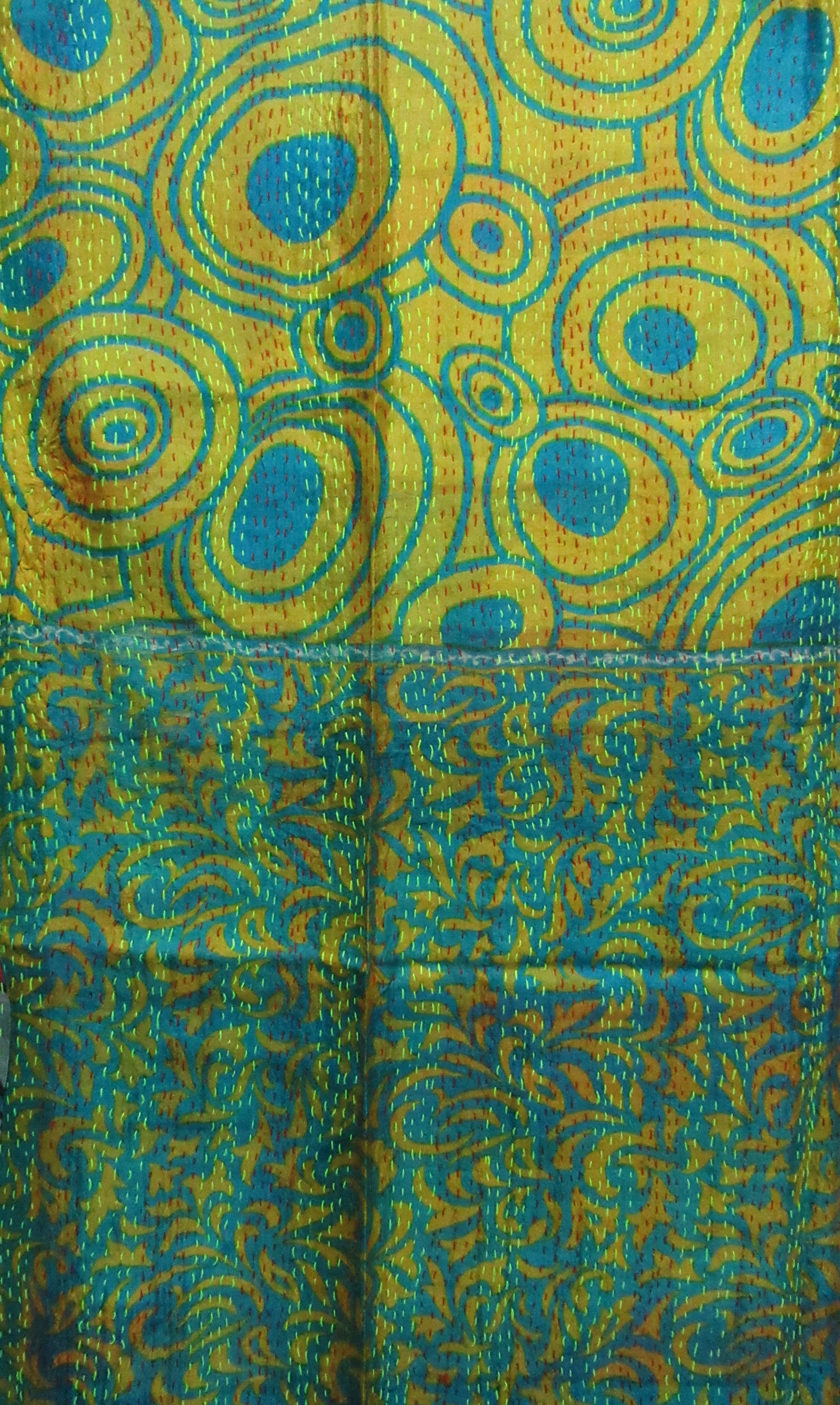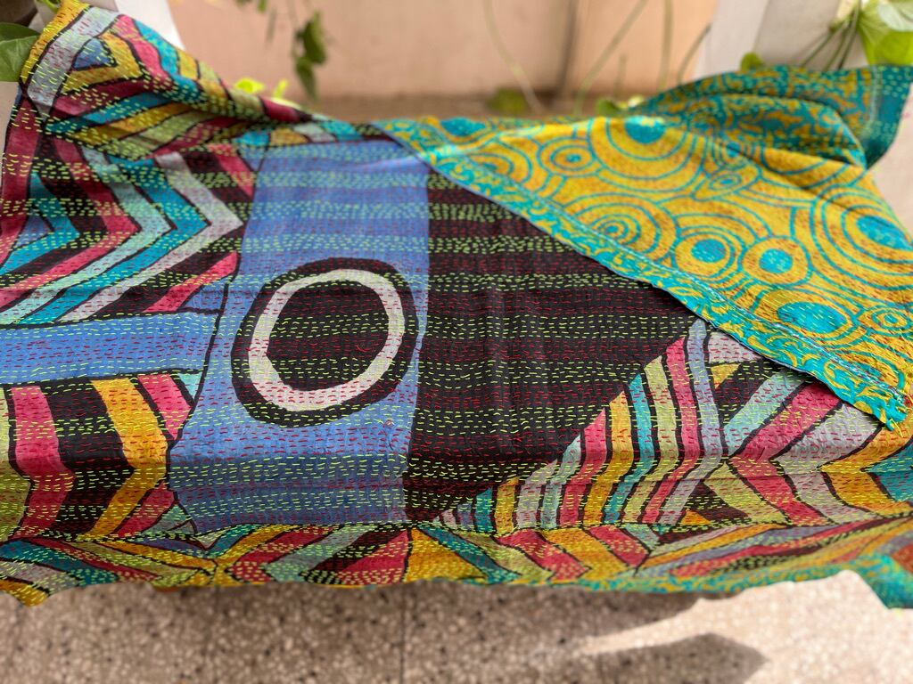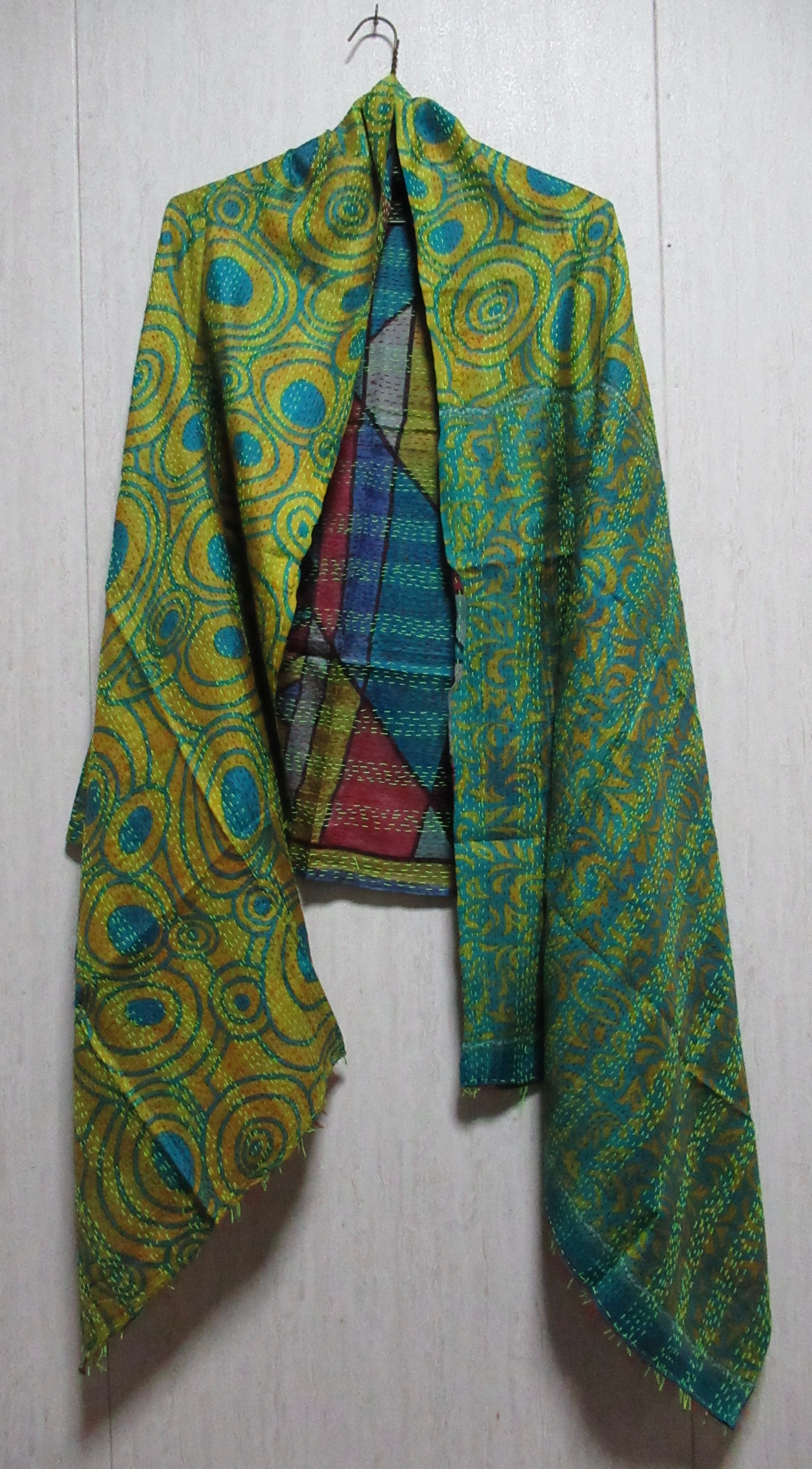 【インド】オールドサリーのカンタ刺繍リバーシブルストール&マルチカバー(国内送料無料)
