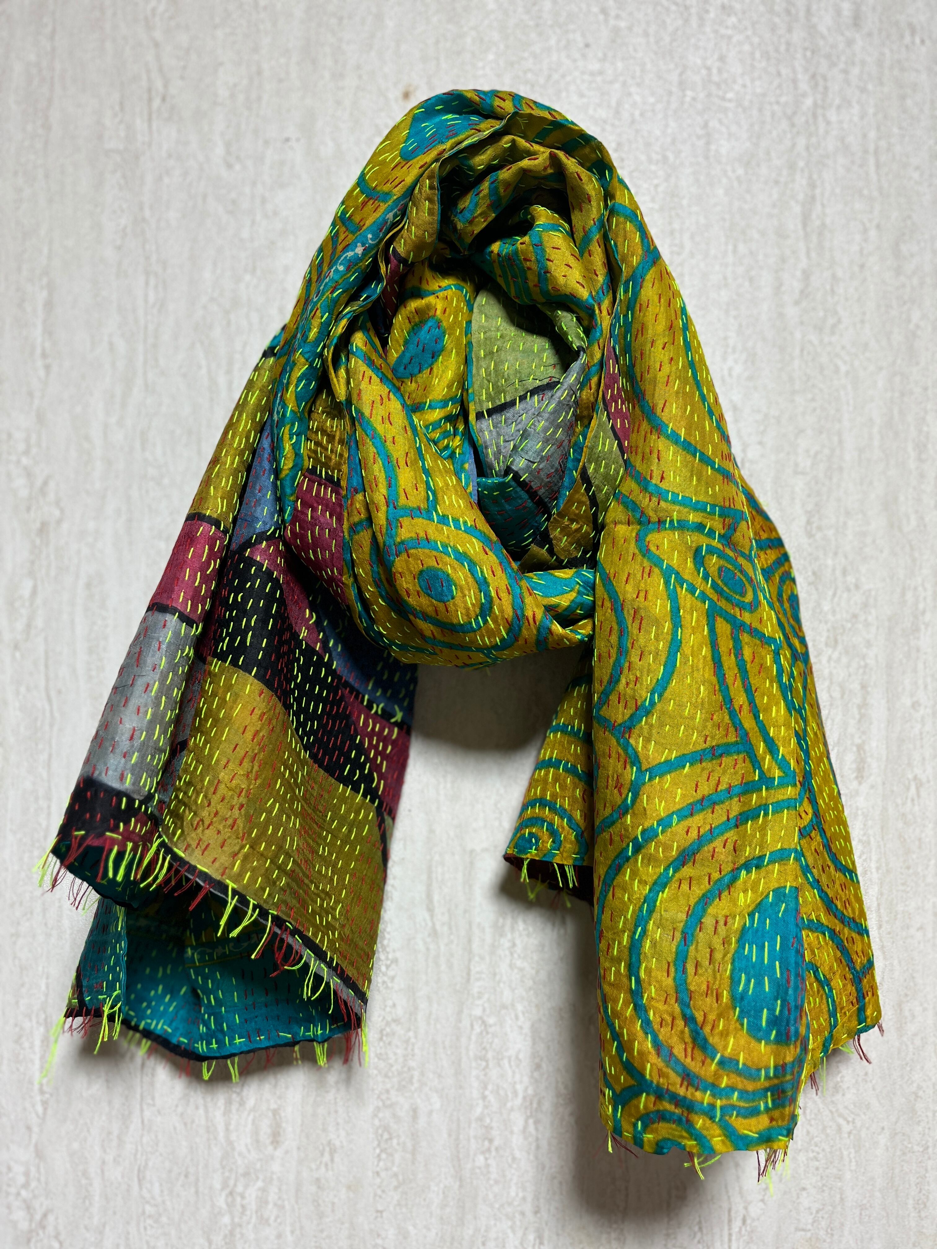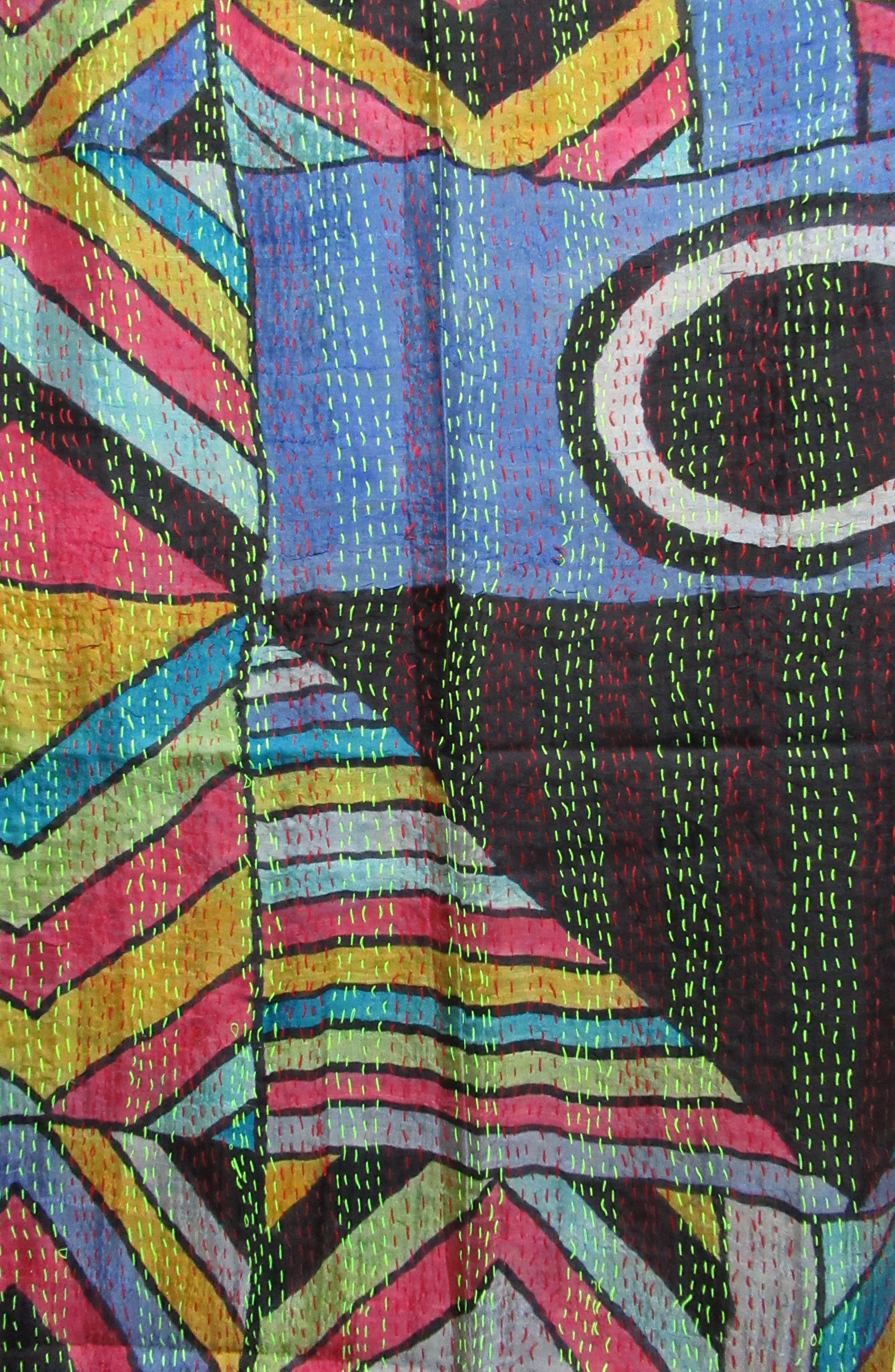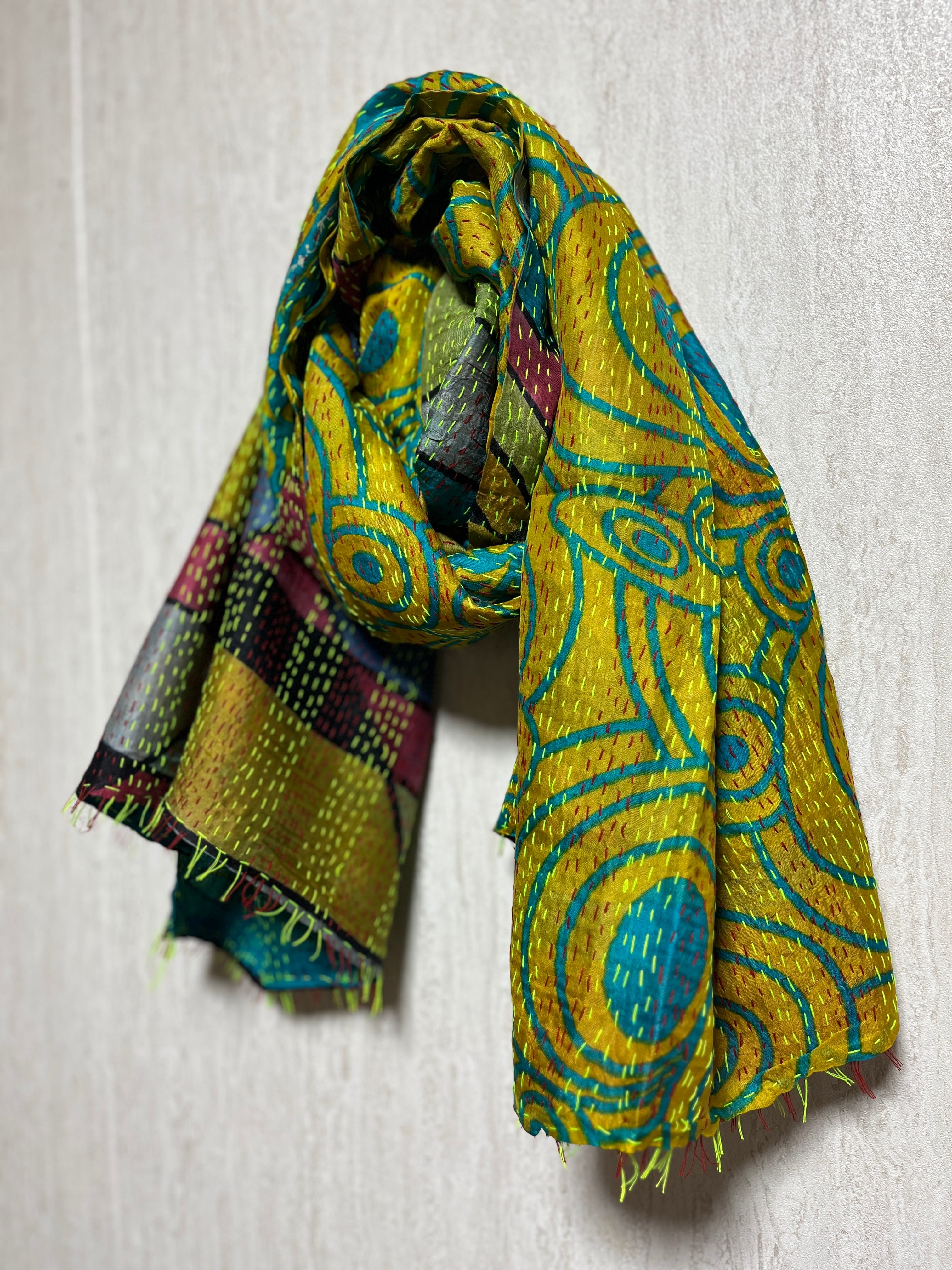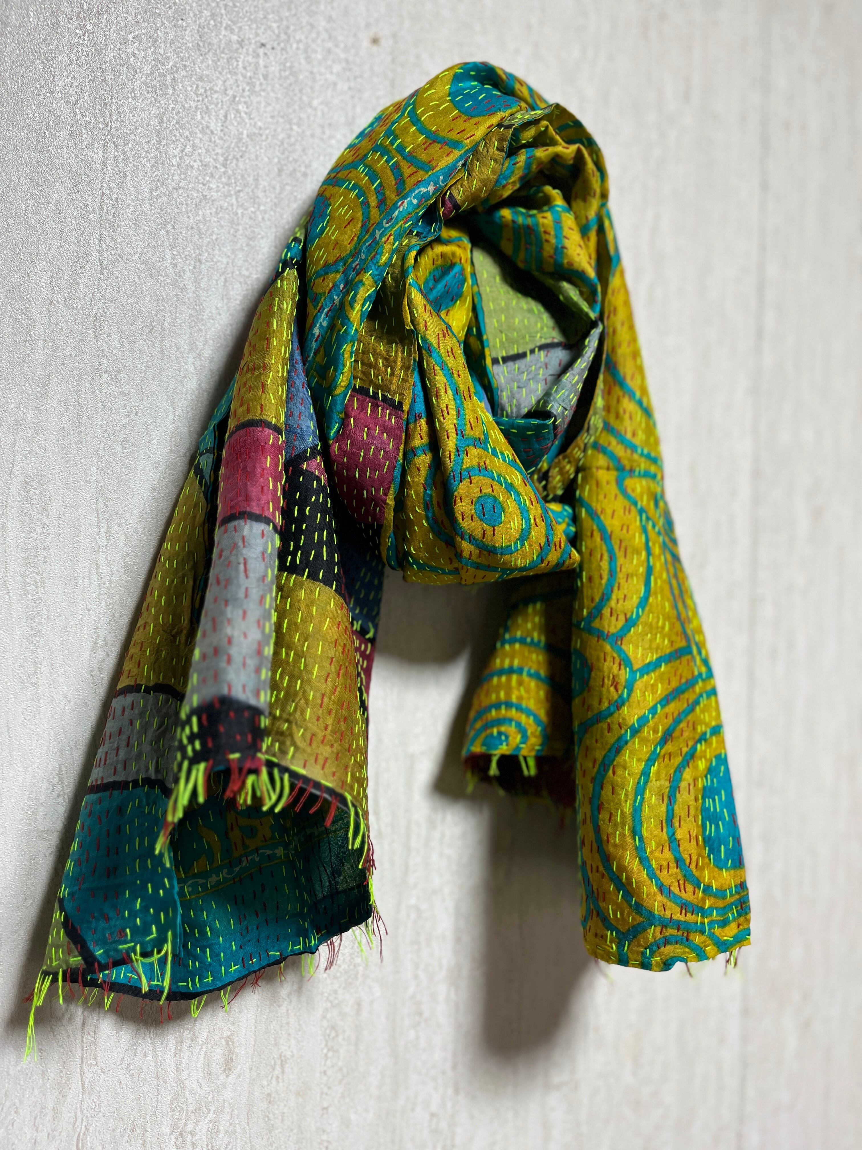 【インド】オールドサリーのカンタ刺繍リバーシブルストール&マルチカバー(国内送料無料)