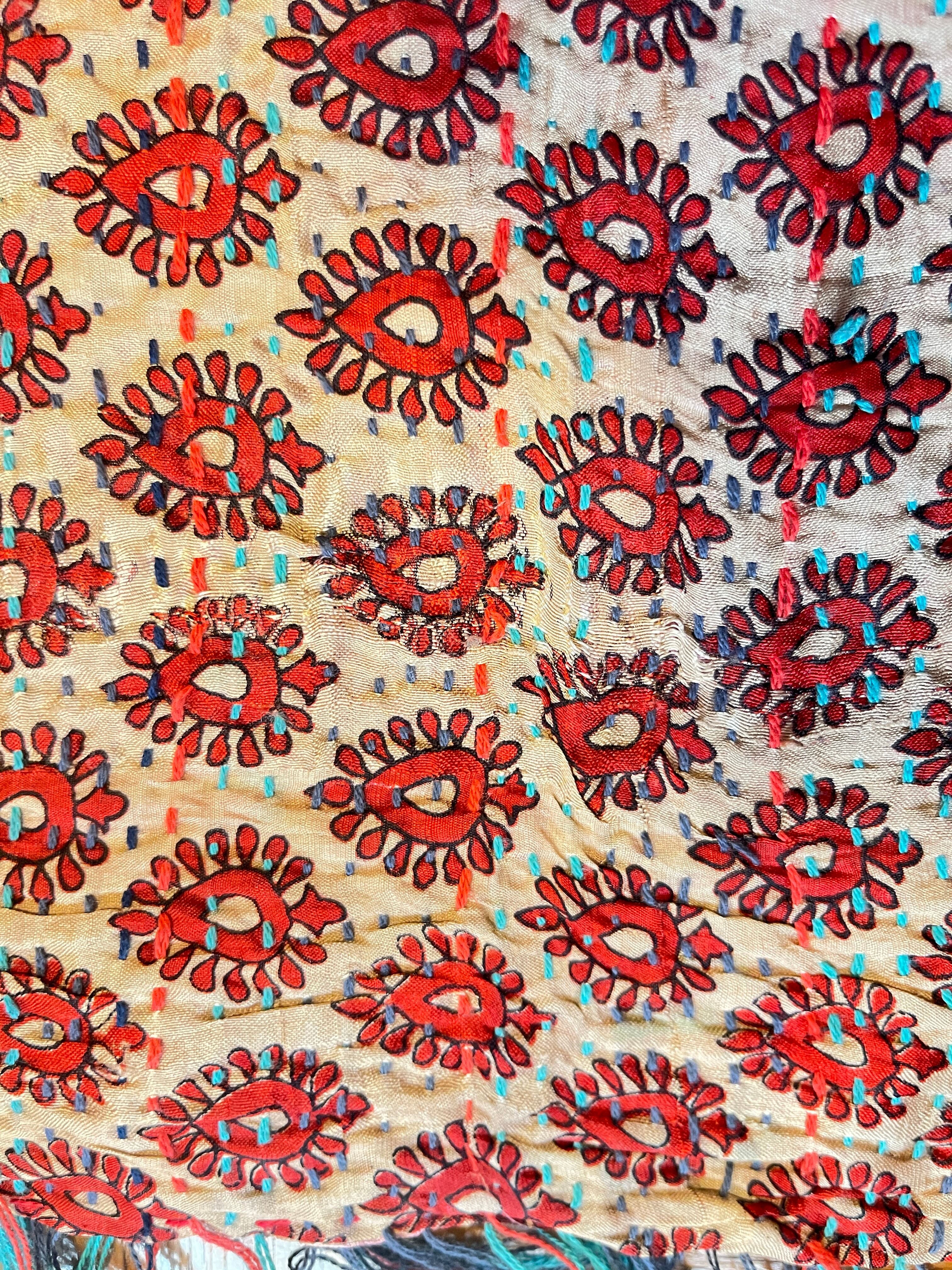 オールドサリーならではの独特の色味と、1針1針手仕事で刺している刺繍で、大変丈夫な布となっています。ストールやマルチカバー(テーブルクロスやベッドカバーなど)以外にも、カバンやお洋服の生地としても使っていただけます。