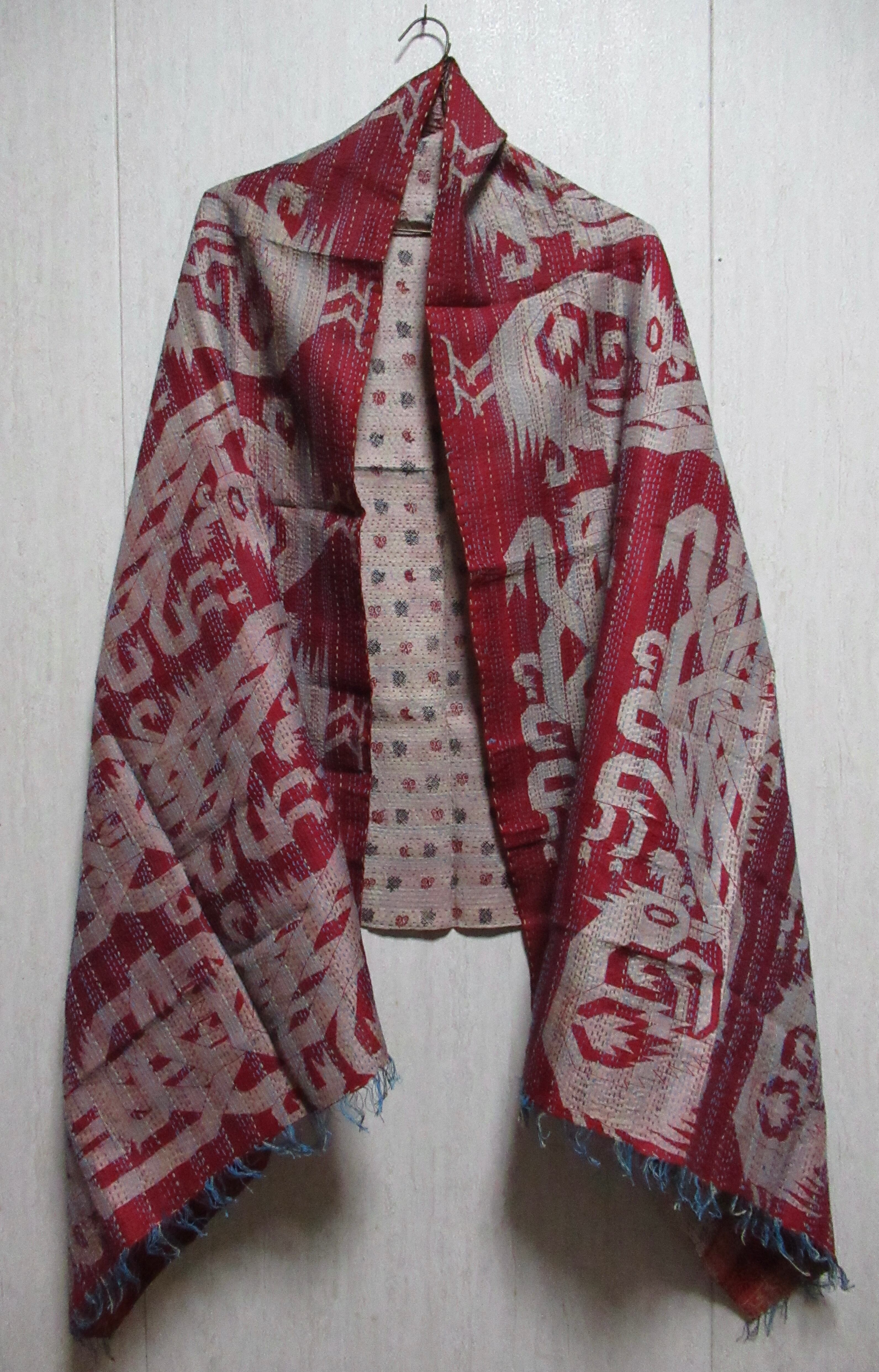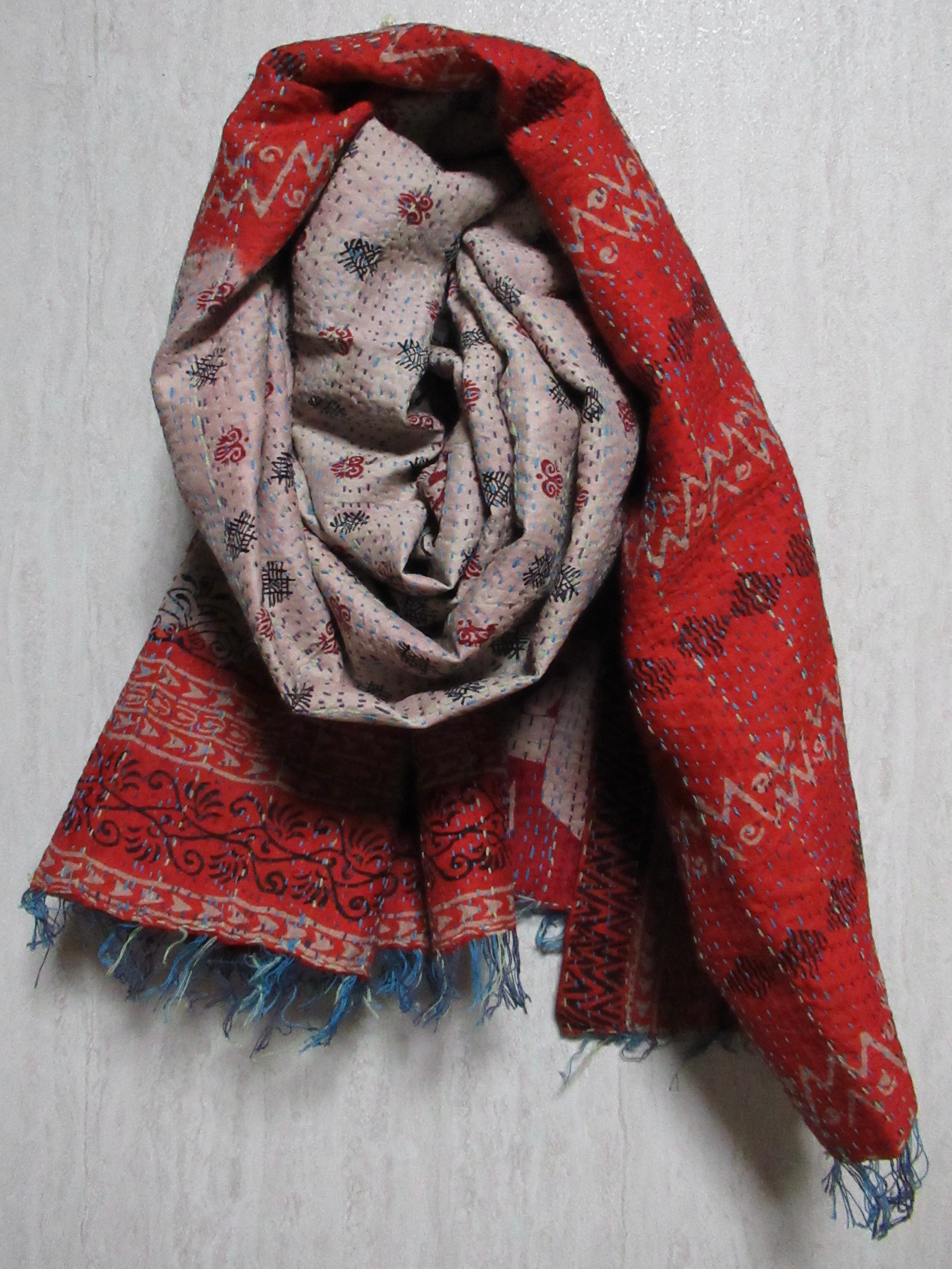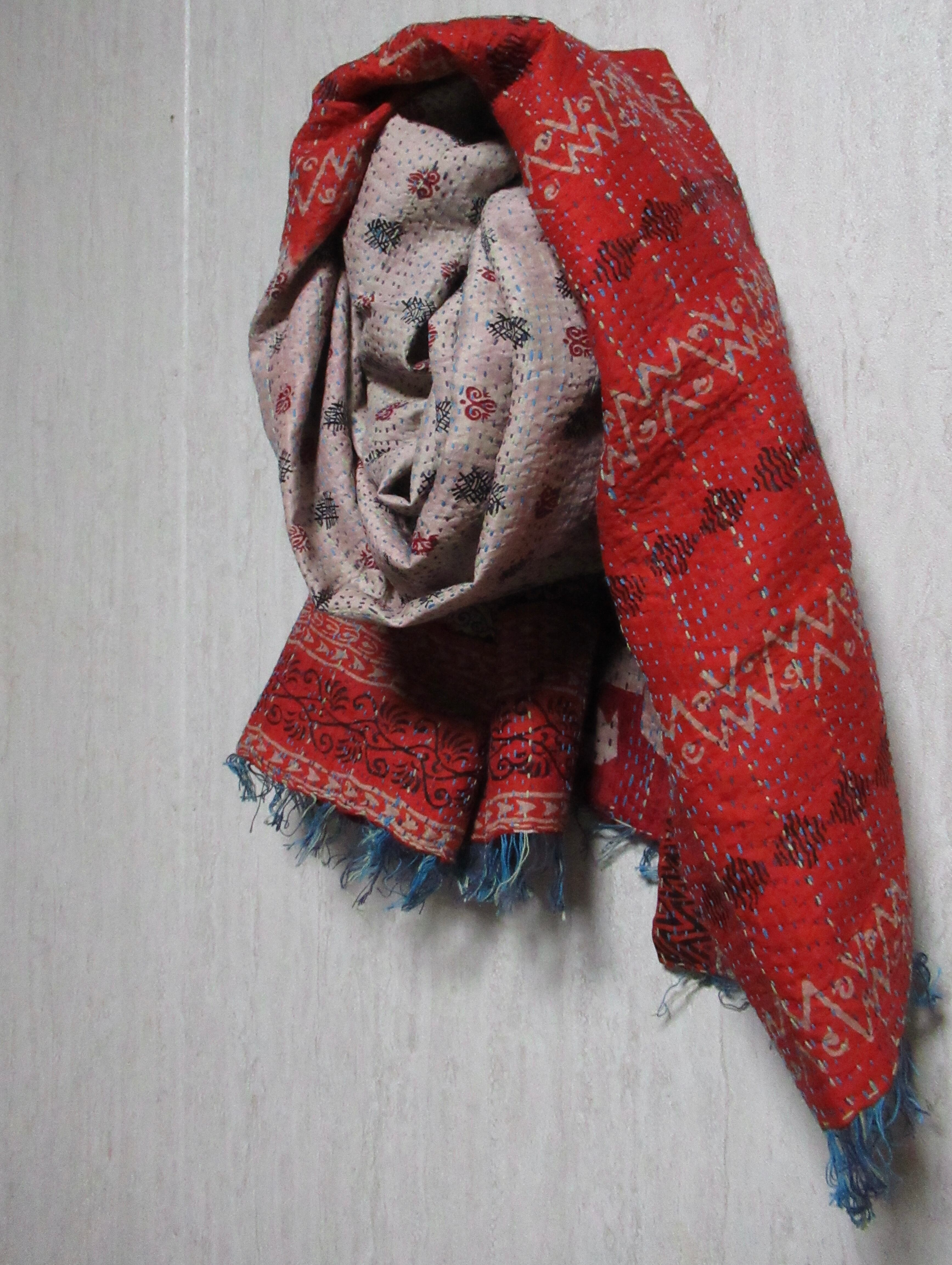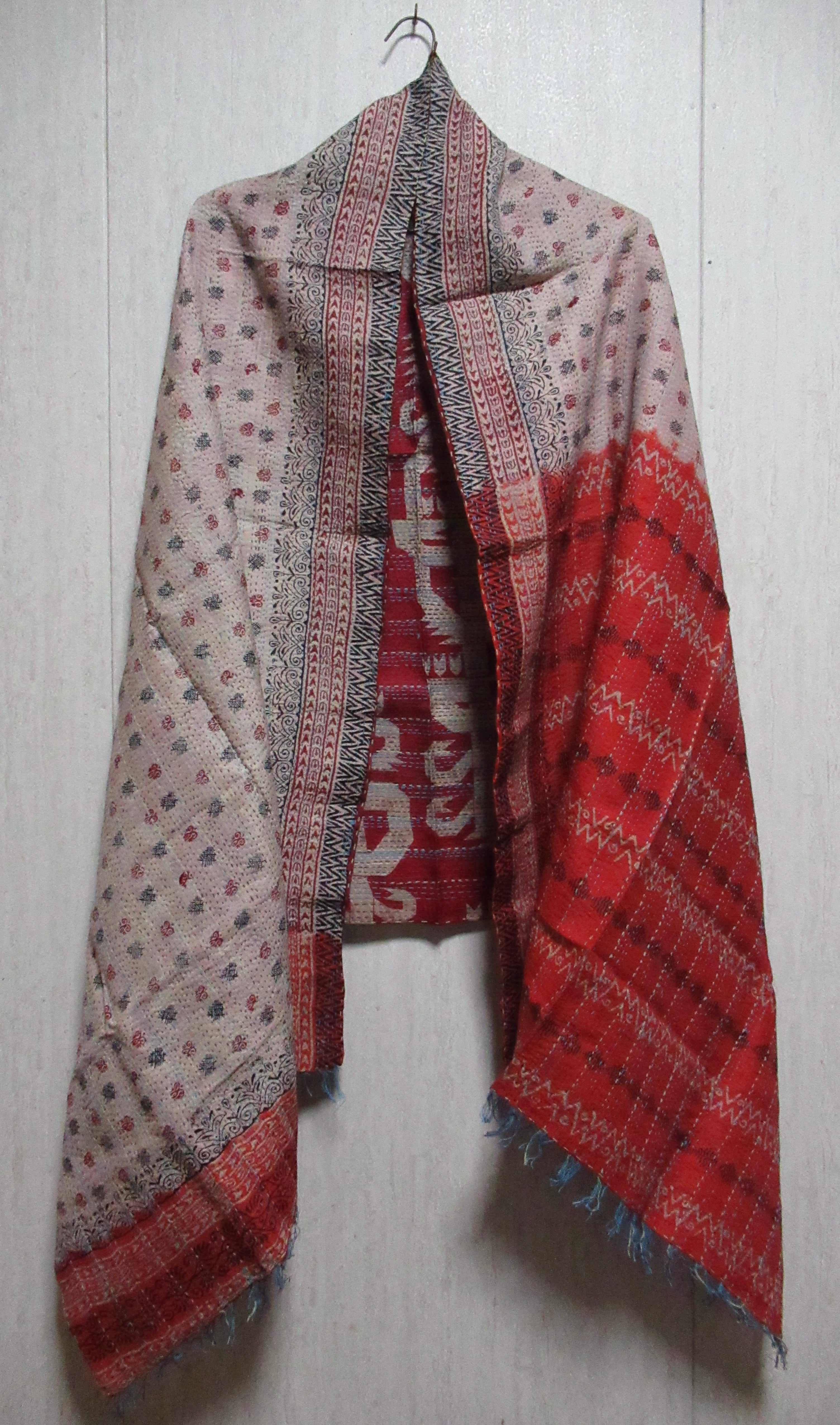 【インド】オールドサリーのカンタ刺繍リバーシブルストール&マルチカバー(国内送料無料)