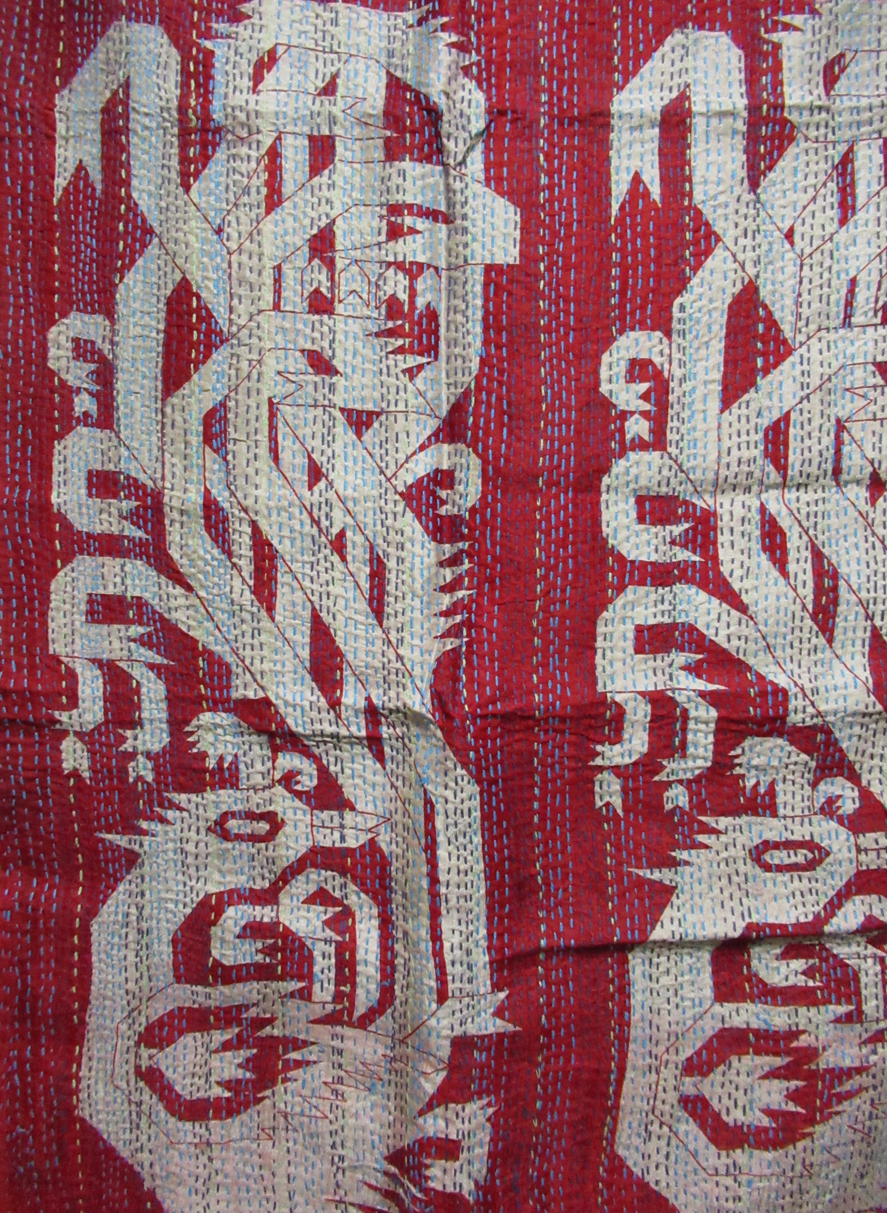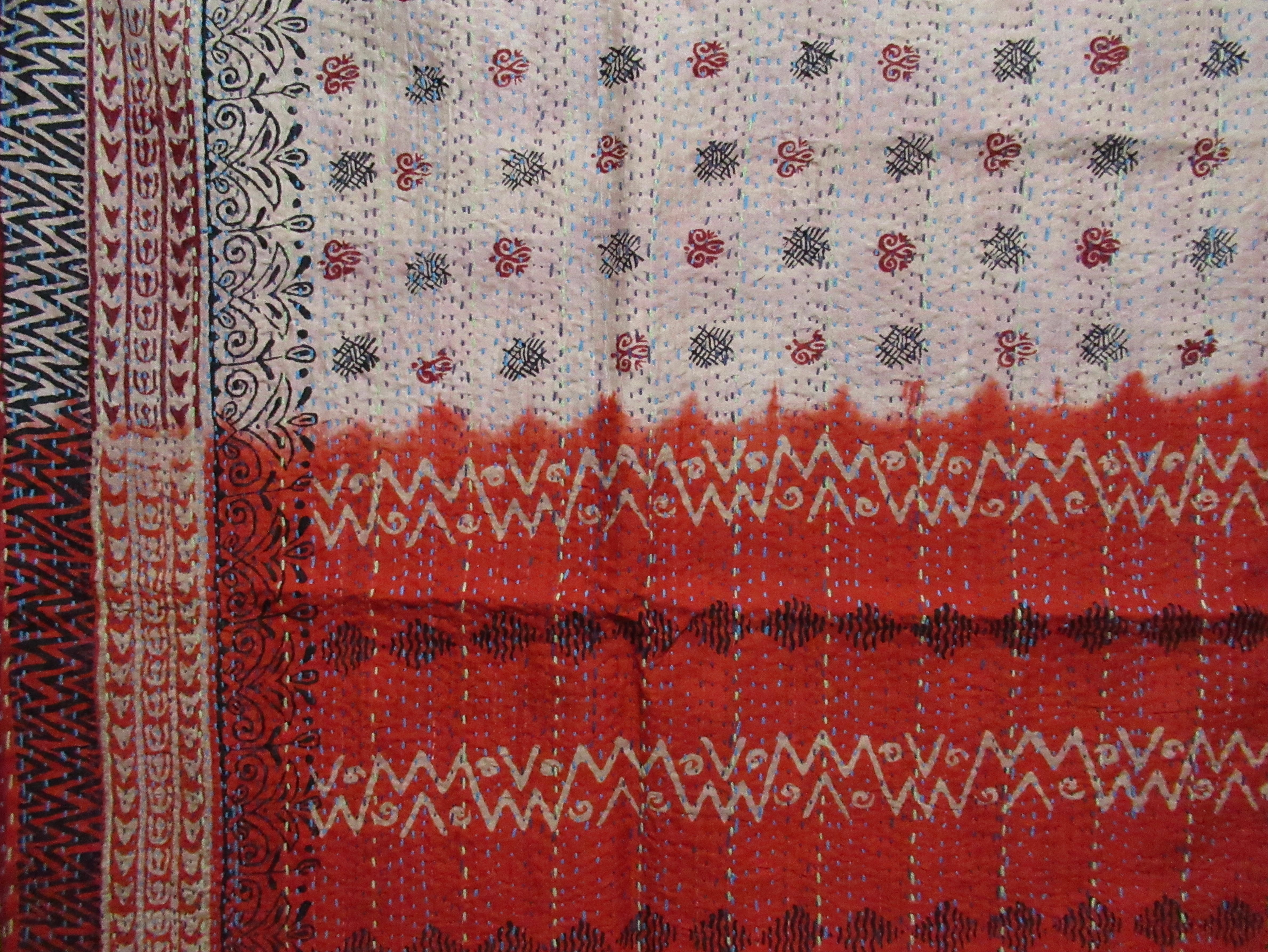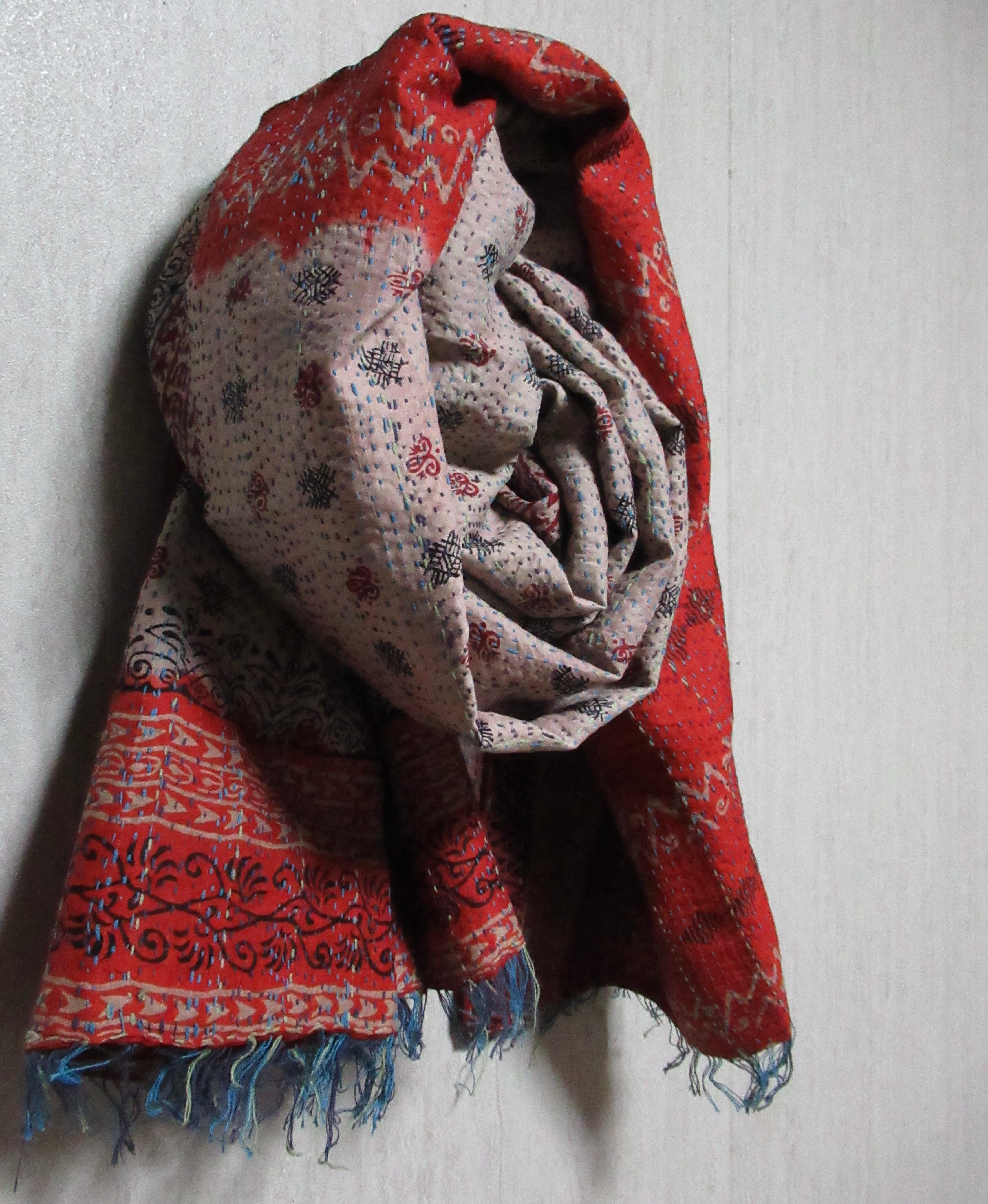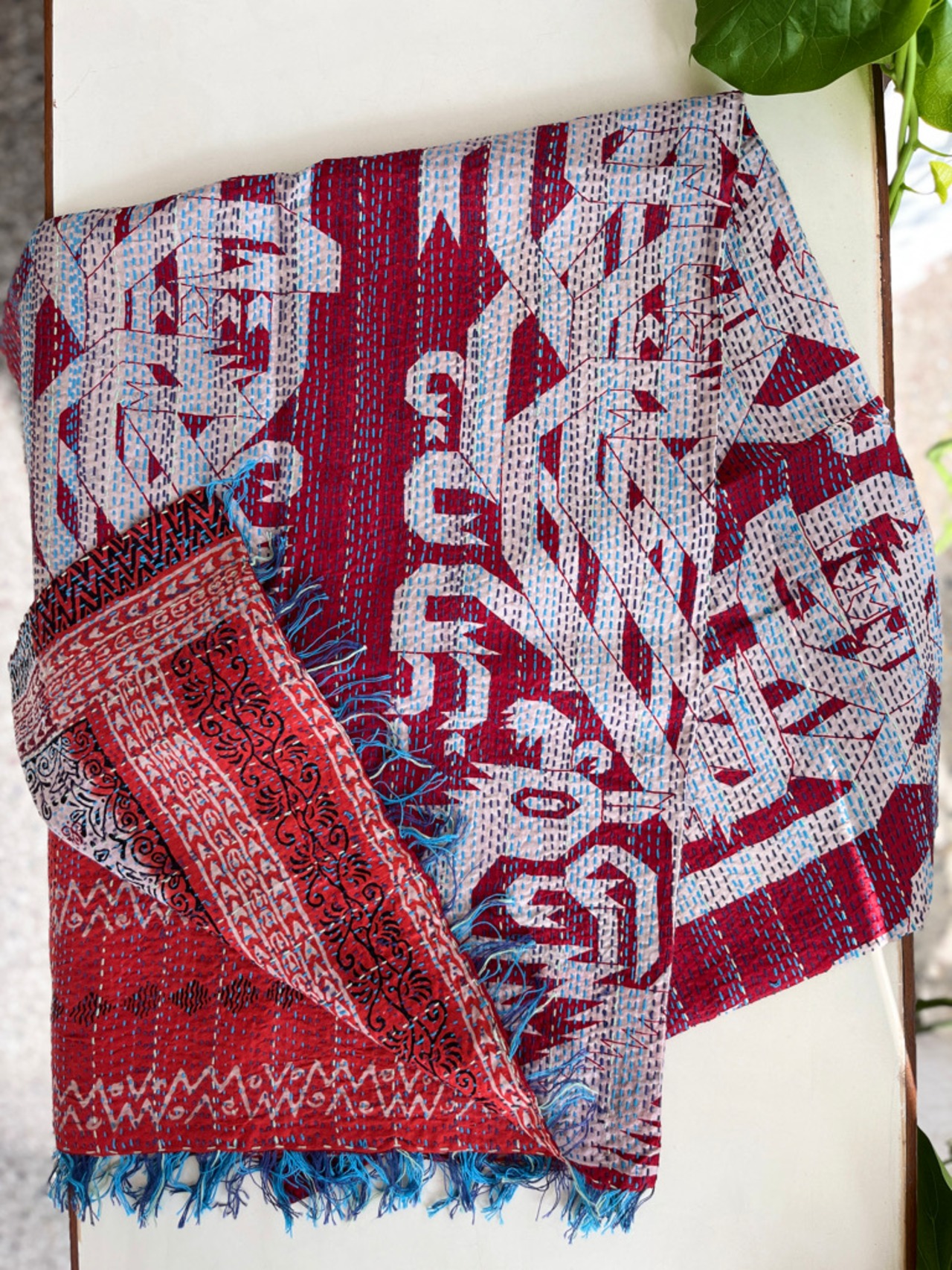 【インド】オールドサリーのカンタ刺繍リバーシブルストール&マルチカバー(国内送料無料)
