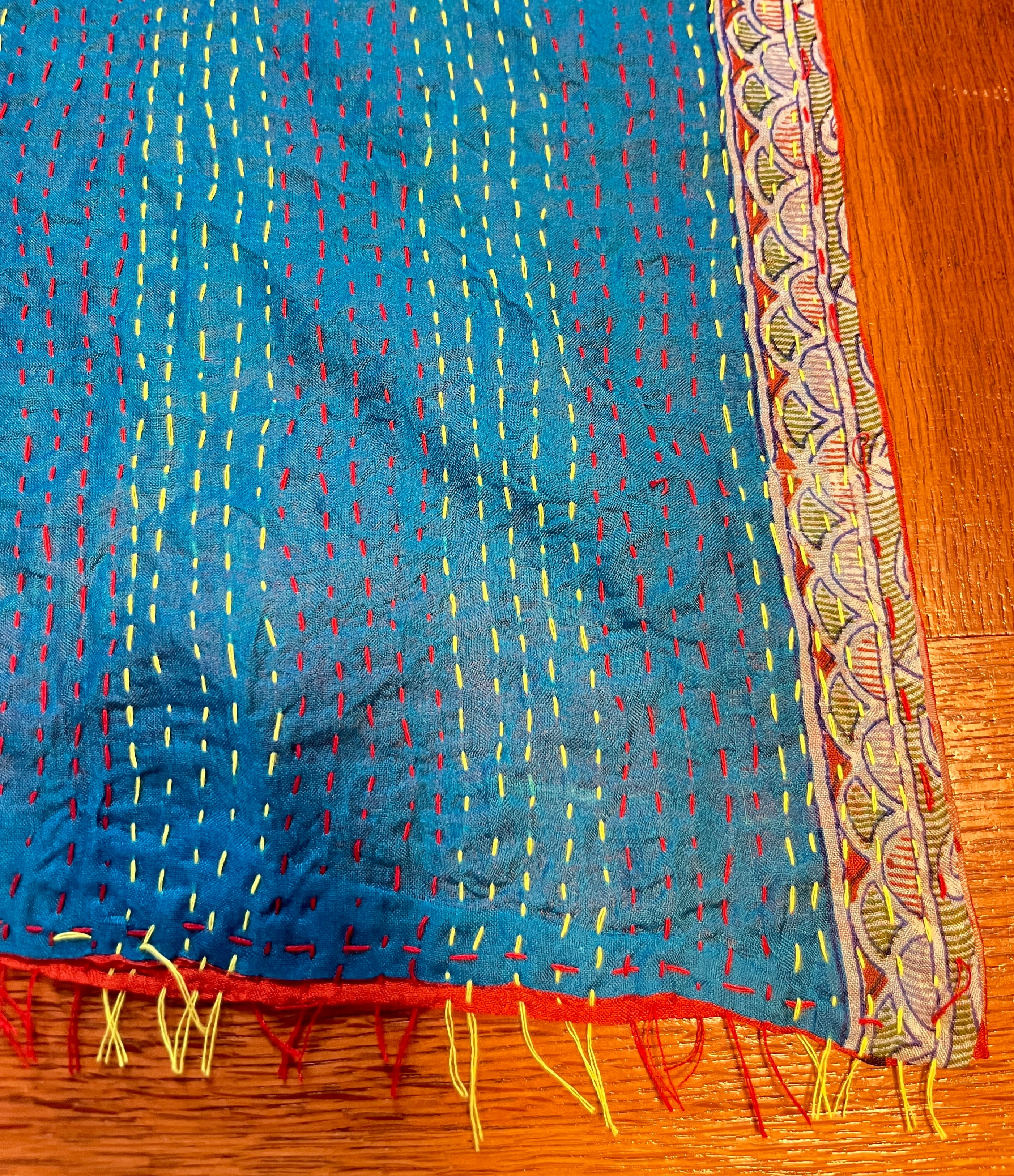 オールドサリーならではの独特の色味と、1針1針手仕事で刺している刺繍で、大変丈夫な布となっています。ストールやマルチカバー(テーブルクロスやベッドカバーなど)以外にも、カバンやお洋服の生地としても使っていただけます。