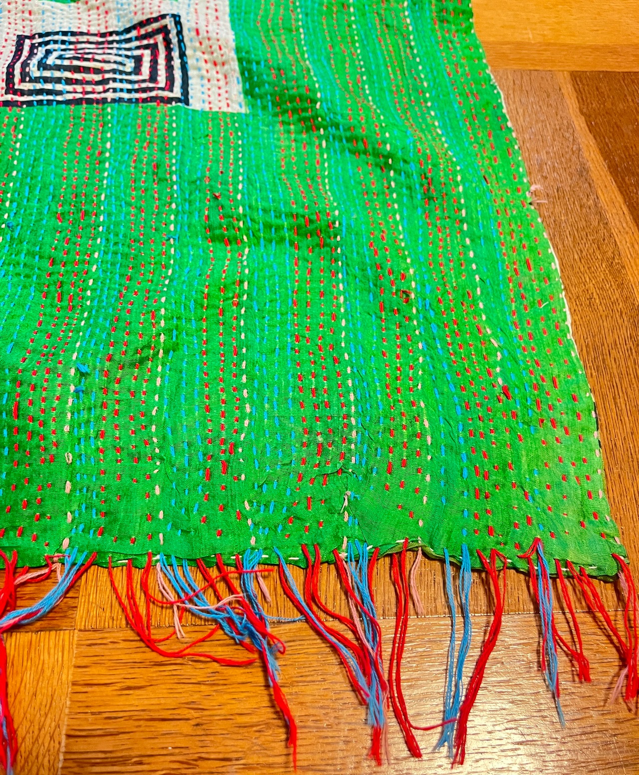 オールドサリーならではの独特の色味と、1針1針手仕事で刺している刺繍で、大変丈夫な布となっています。ストールやマルチカバー(テーブルクロスやベッドカバーなど)以外にも、カバンやお洋服の生地としても使っていただけます。