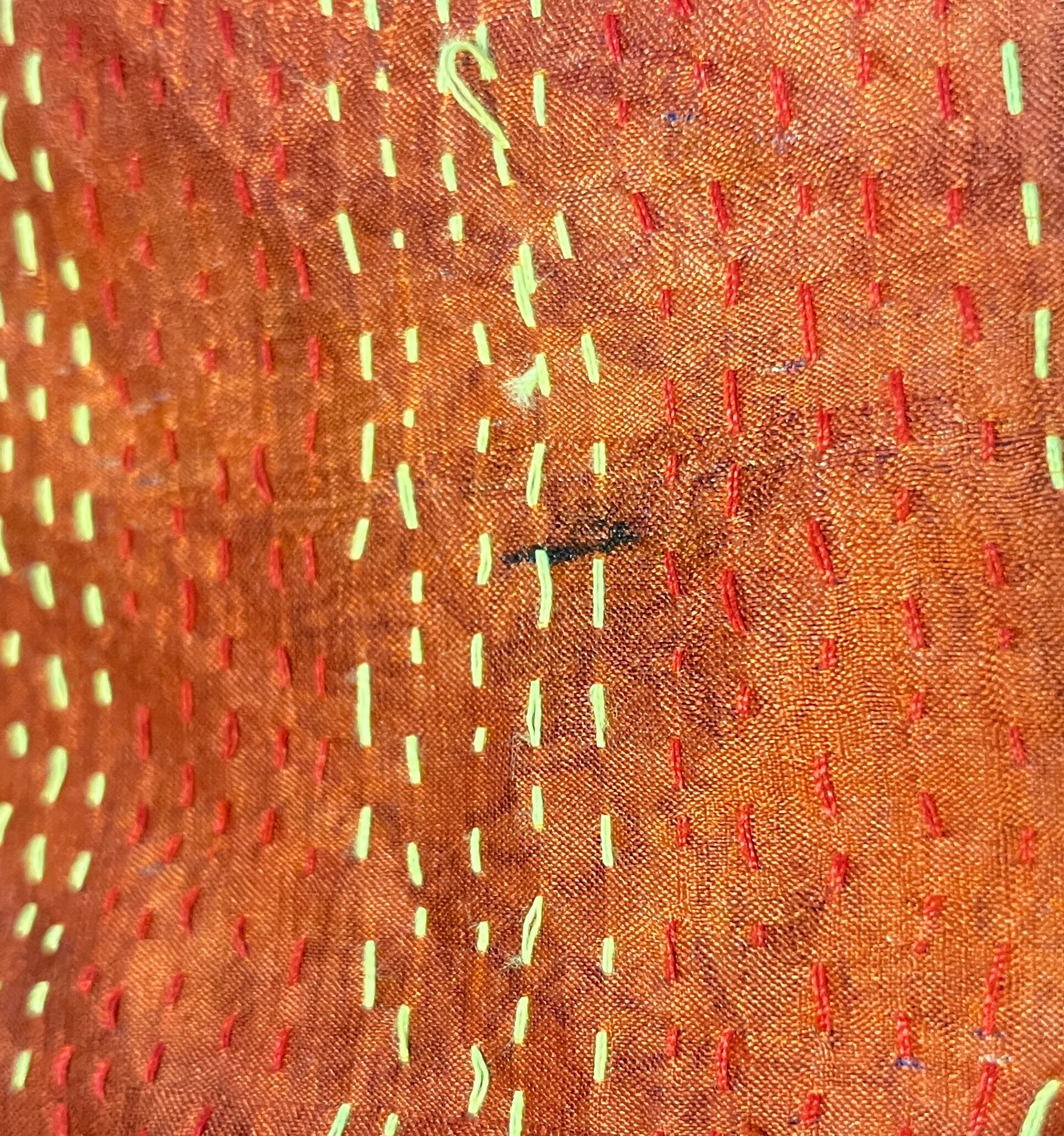・インドの女性たちが、1針1針手縫いで刺繍しており、真っ直ぐには縫われておらず曲がったり、寄れていたり、糸が途中で切れているものなどもあります。