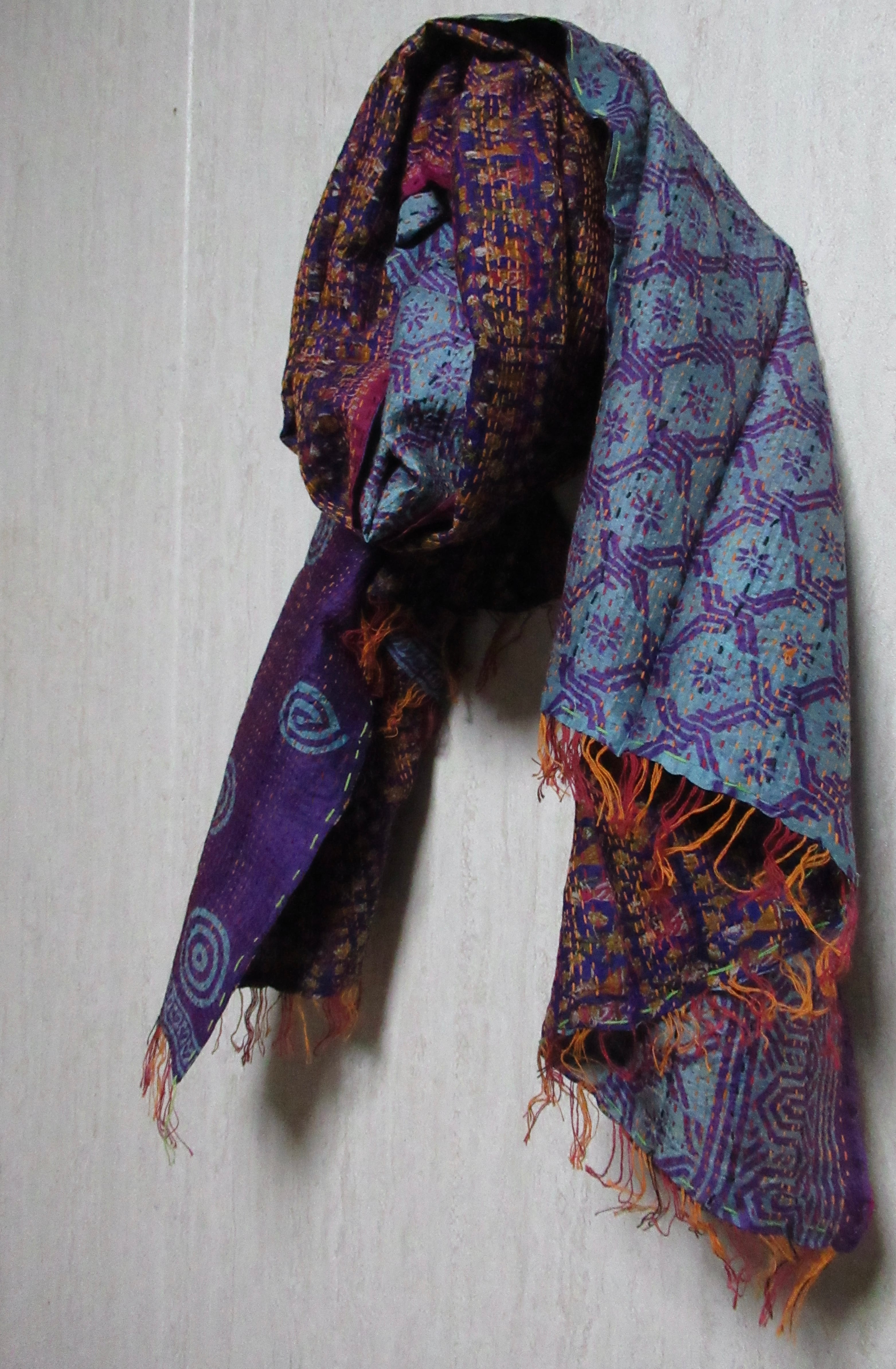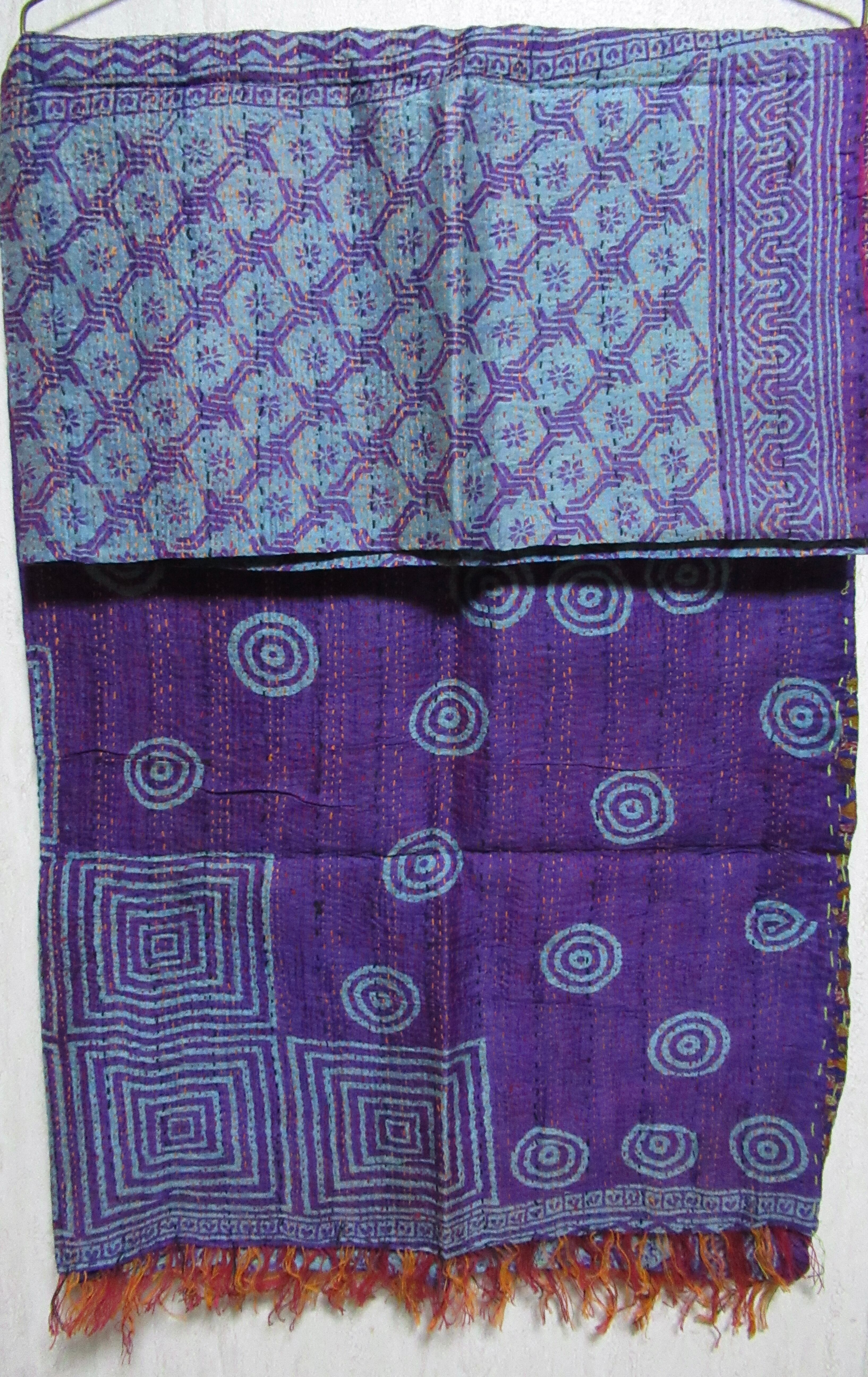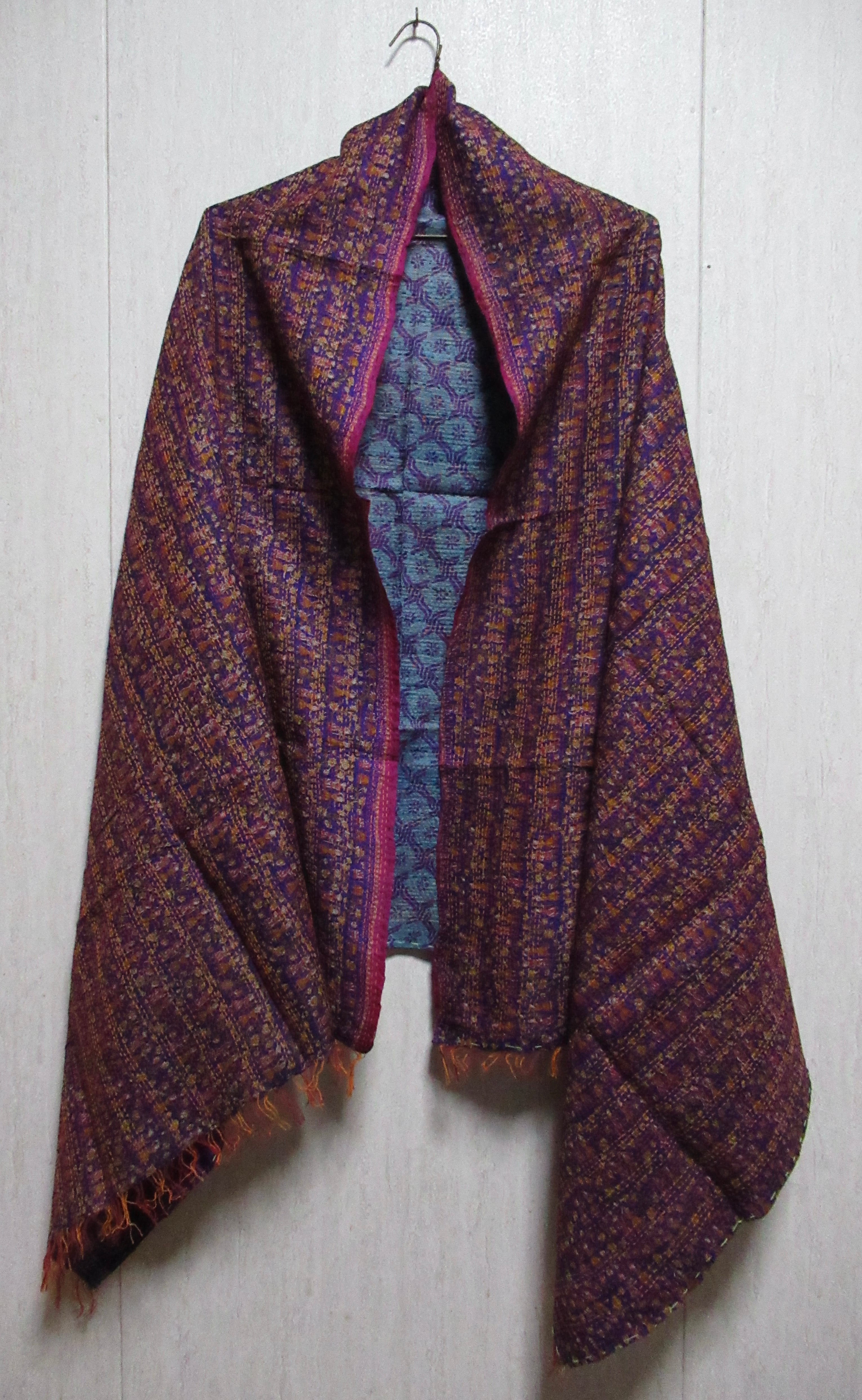 【インド】オールドサリーのカンタ刺繍リバーシブルストール&マルチカバー(国内送料無料)