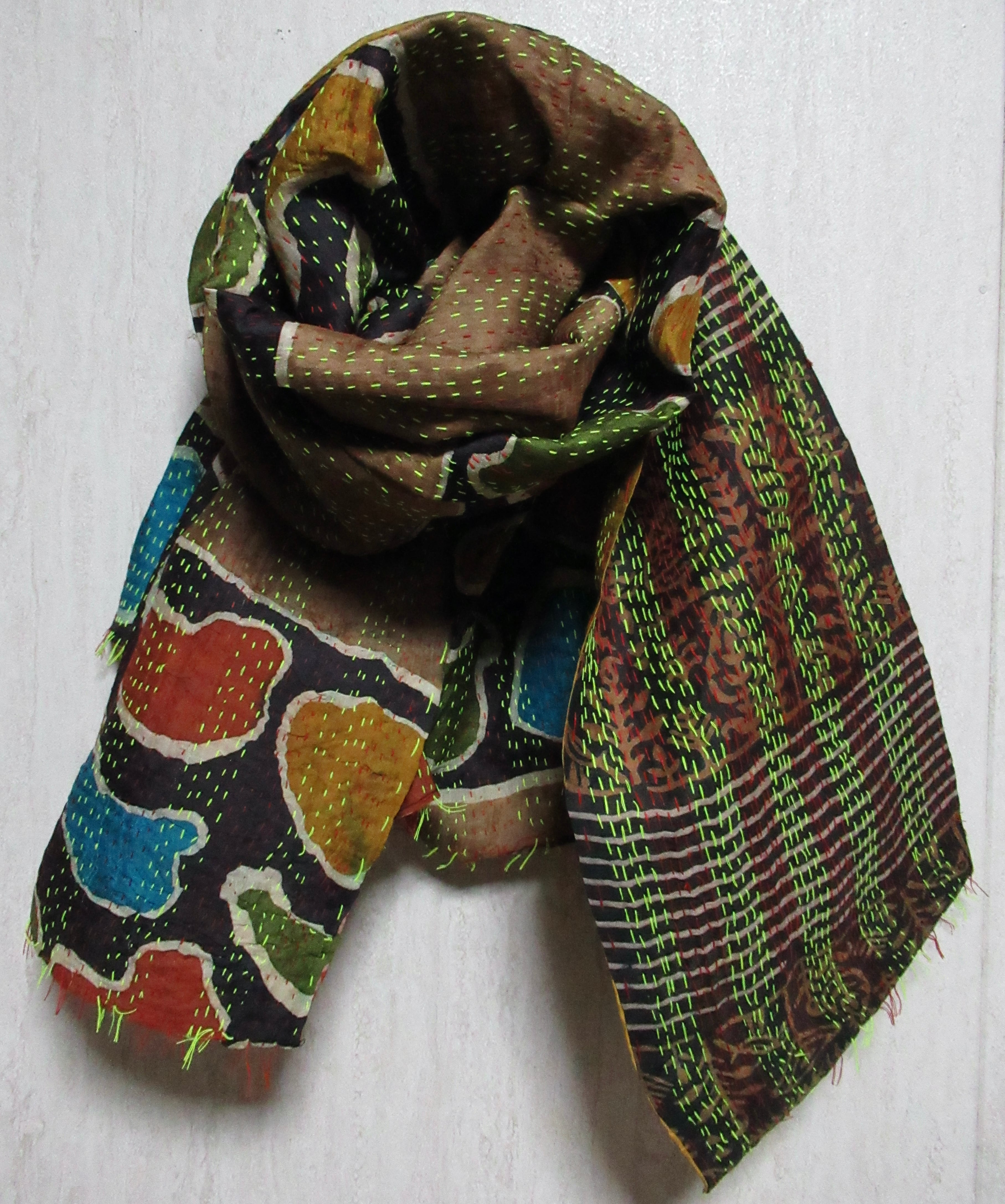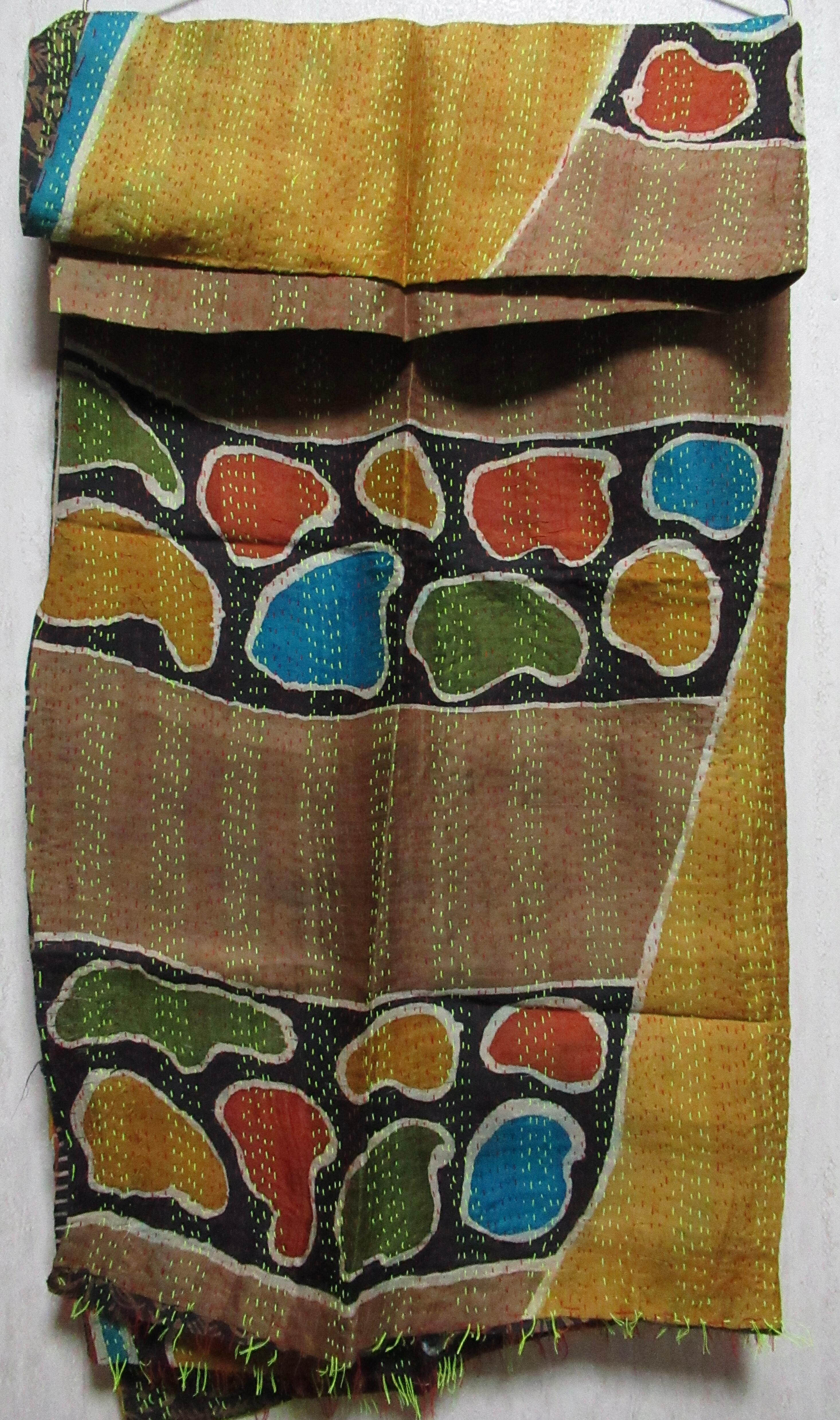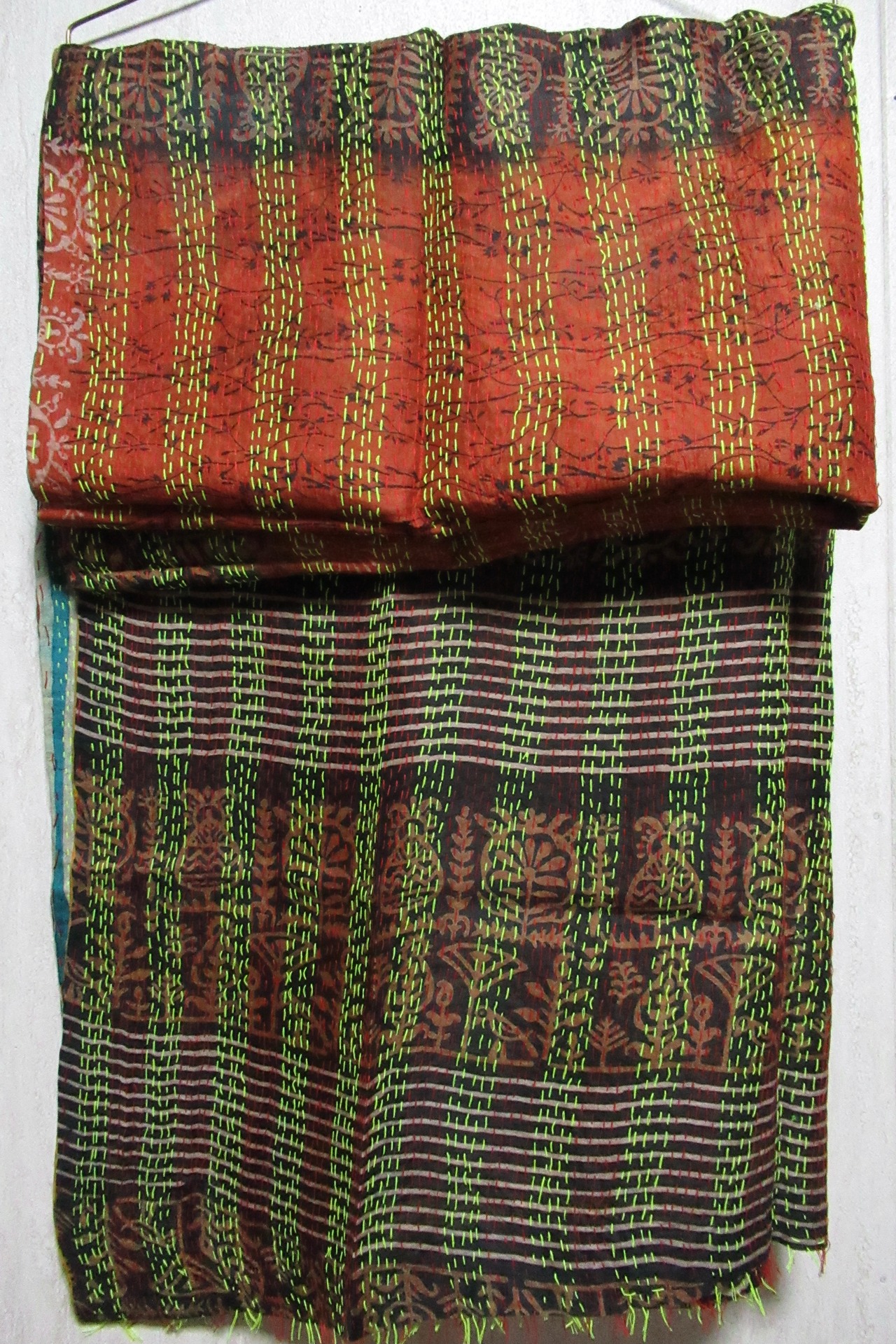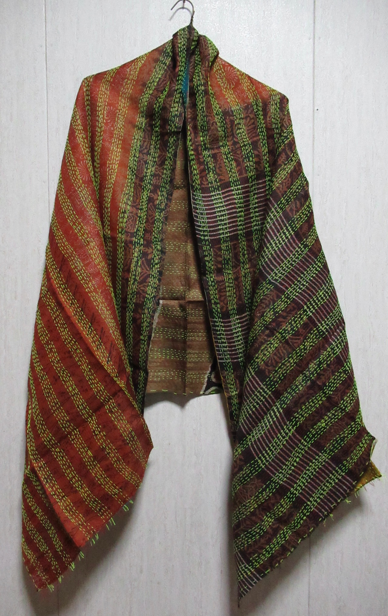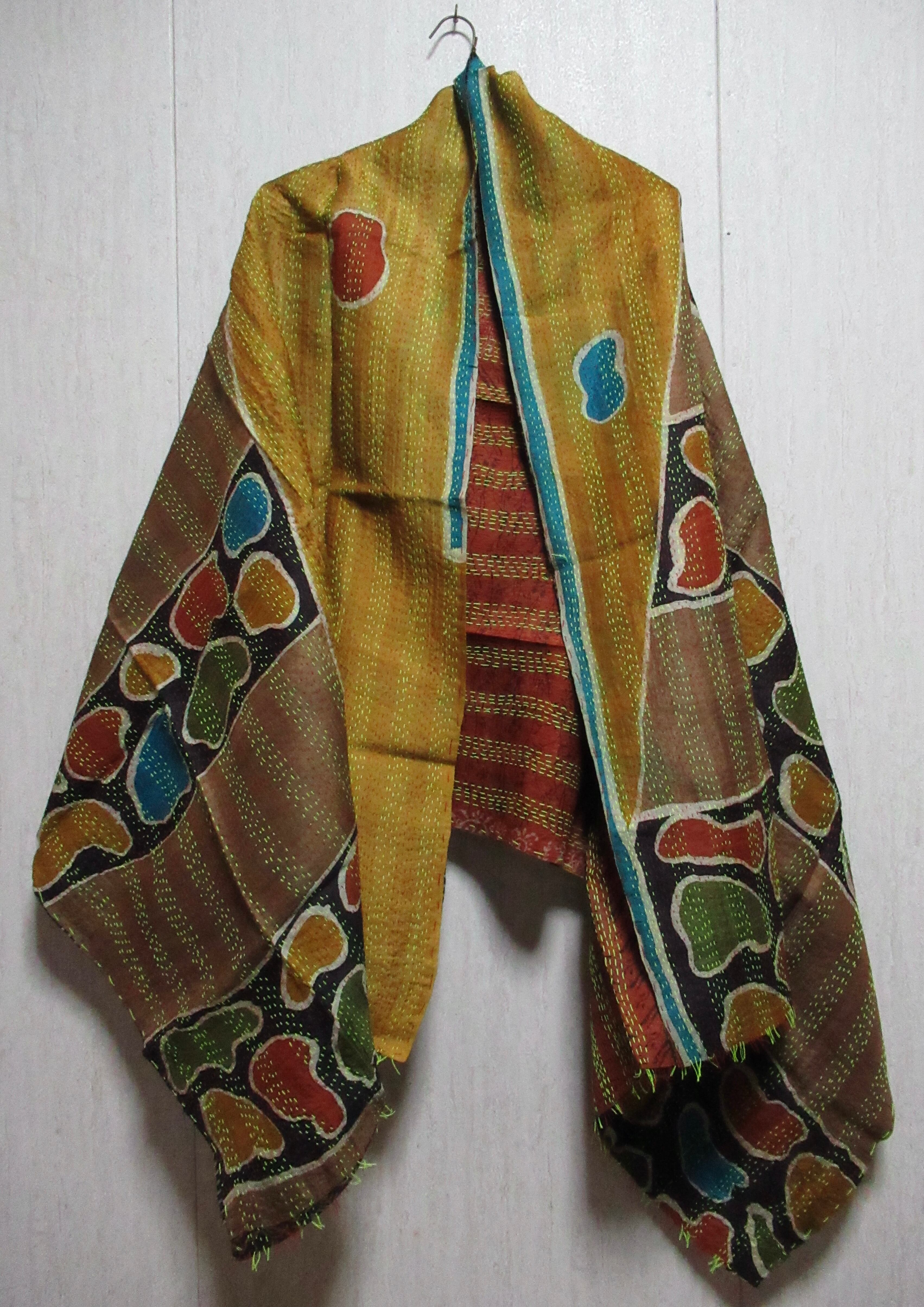 【インド】オールドサリーのカンタ刺繍リバーシブルストール&マルチカバー(国内送料無料)
