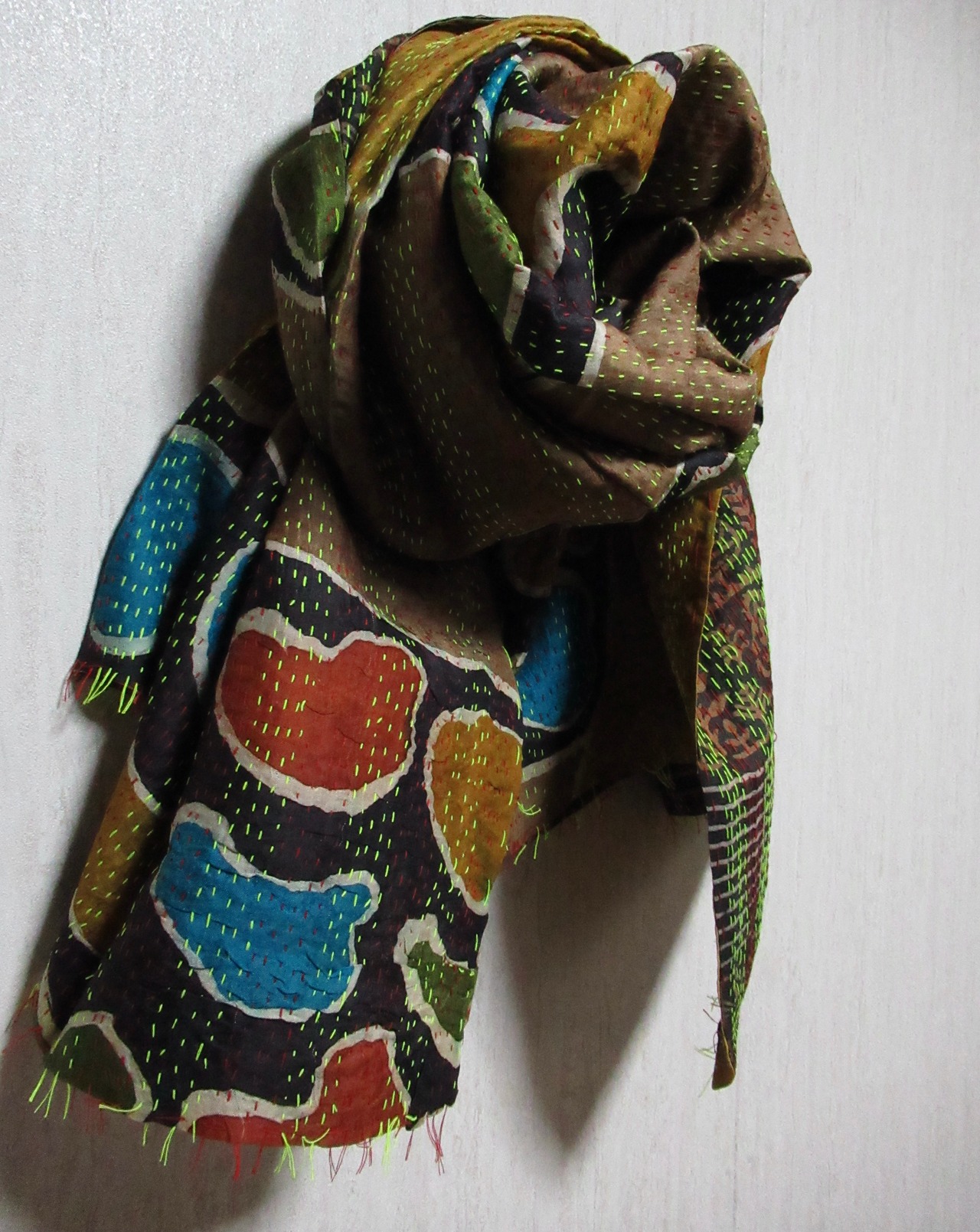 オールドサリーならではの独特の色味と、1針1針手仕事で刺している刺繍で、大変丈夫な布となっています。ストールやマルチカバー(テーブルクロスやベッドカバーなど)以外にも、カバンやお洋服の生地としても使っていただけます。