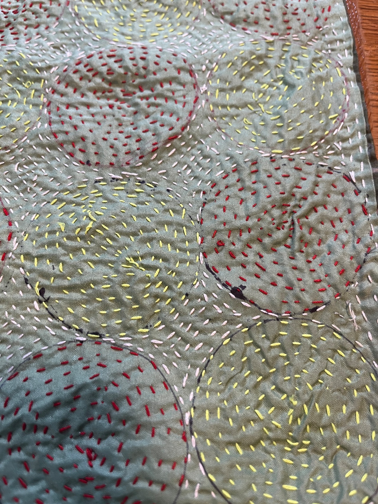 ・インドの女性たちが、1針1針手縫いで刺繍しており、真っ直ぐには縫われておらず曲がったり、寄れていたり、糸が途中で切れているものなどもあります。