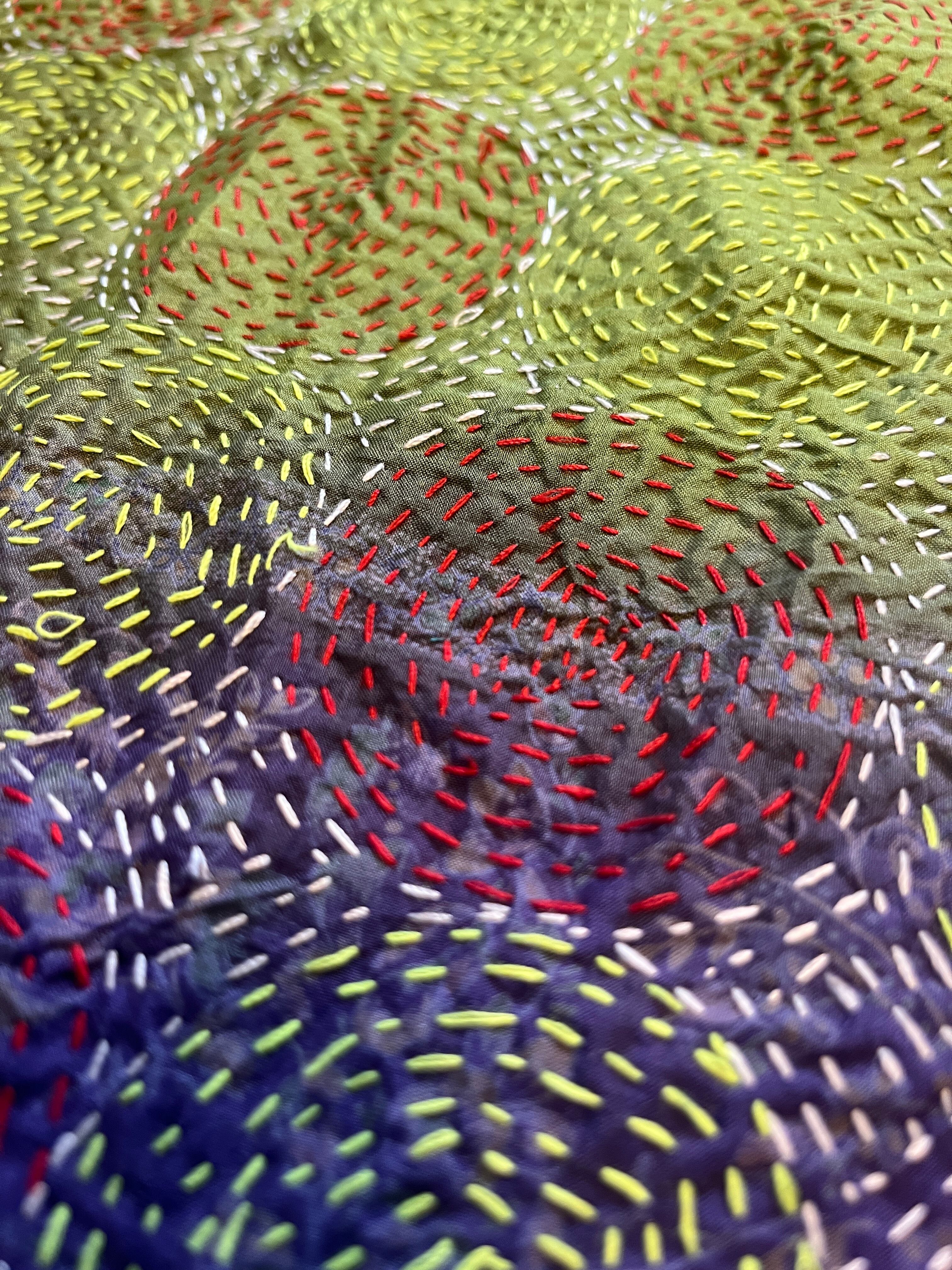 オールドシルク100%の柄の違う生地を、表と裏2枚合わせにして、全体に日本の刺し子のような刺繍がしてあります(商品によりサークル、スクエア、ジグザグ、ラインの刺繍模様です)。