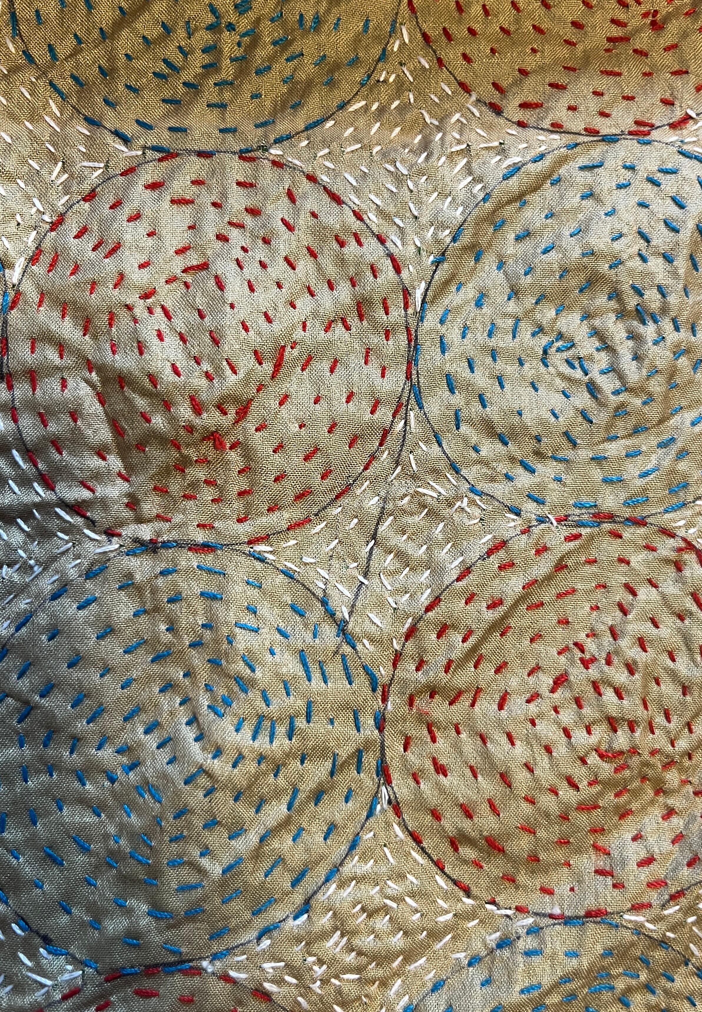 オールドシルク100%の柄の違う生地を、表と裏2枚合わせにして、全体に日本の刺し子のような刺繍がしてあります(商品によりサークル、スクエア、ジグザグ、ラインの刺繍模様です)。
