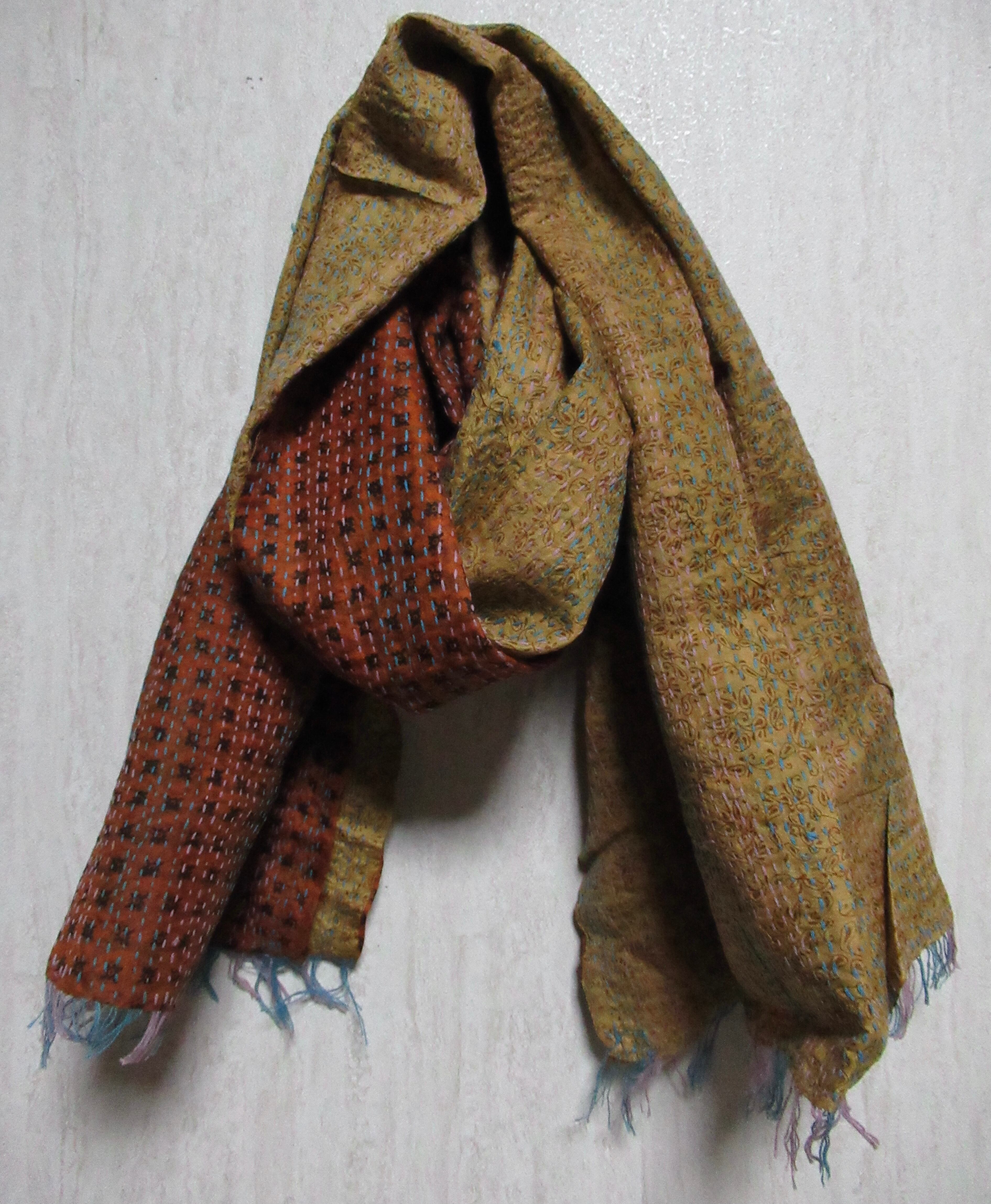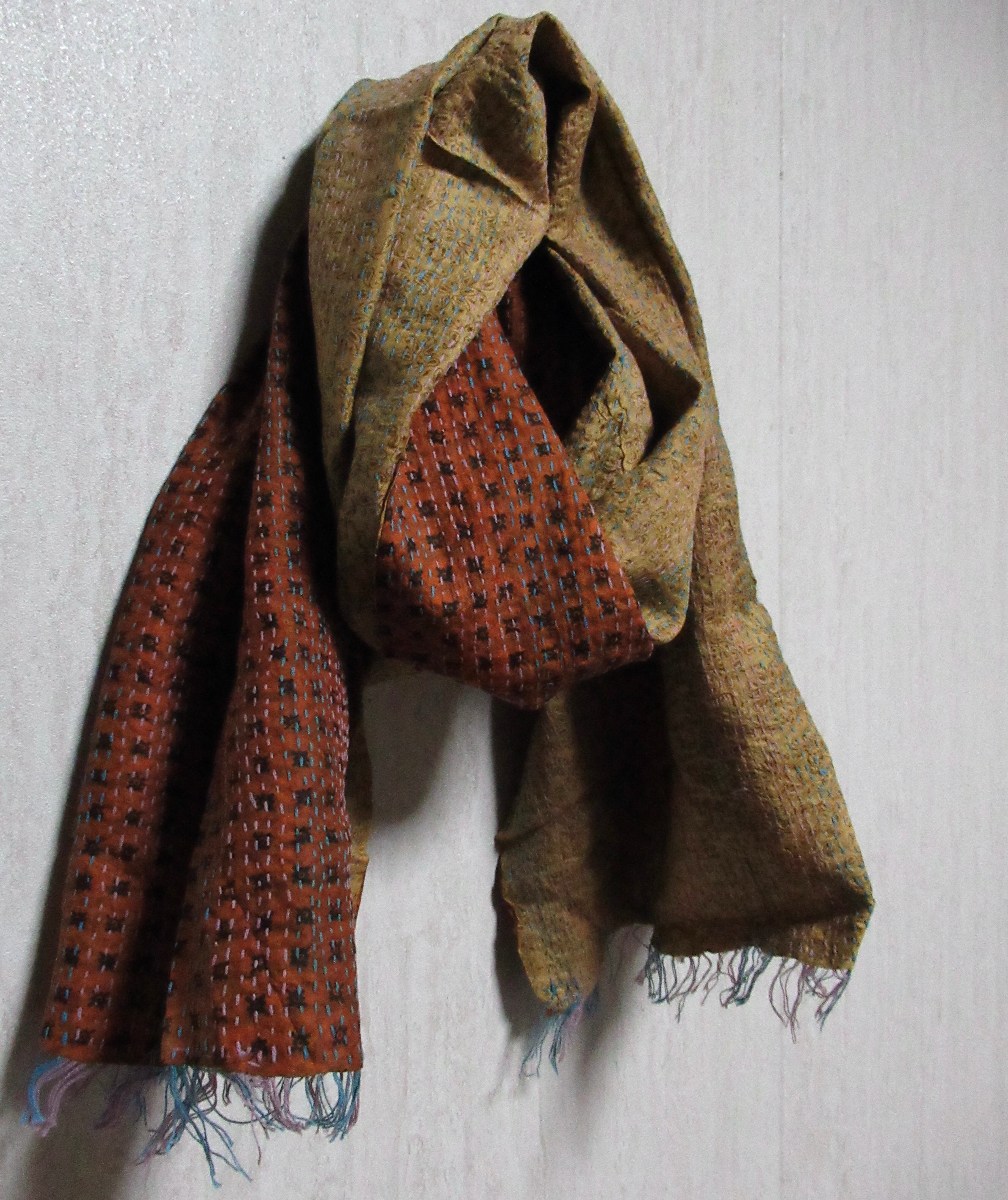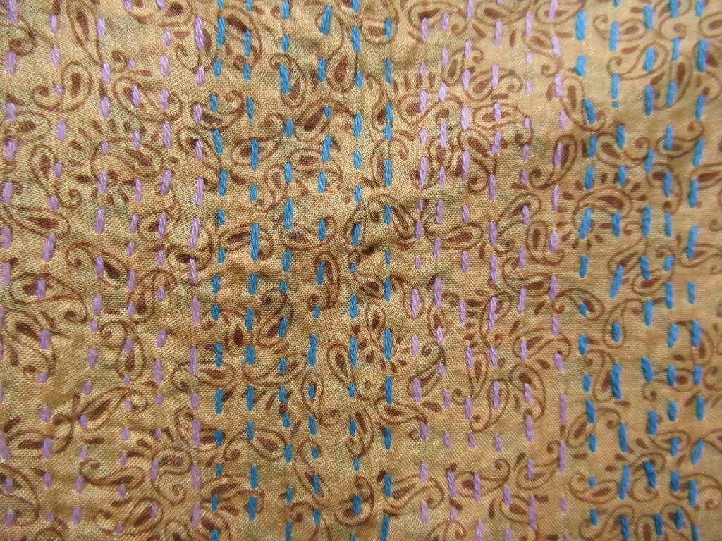 オールドサリーならではの独特の色味と、1針1針手仕事で刺している刺繍で、大変丈夫な布となっています。ストールやマルチカバー(テーブルクロスやベッドカバーなど)以外にも、カバンやお洋服の生地としても使っていただけます。