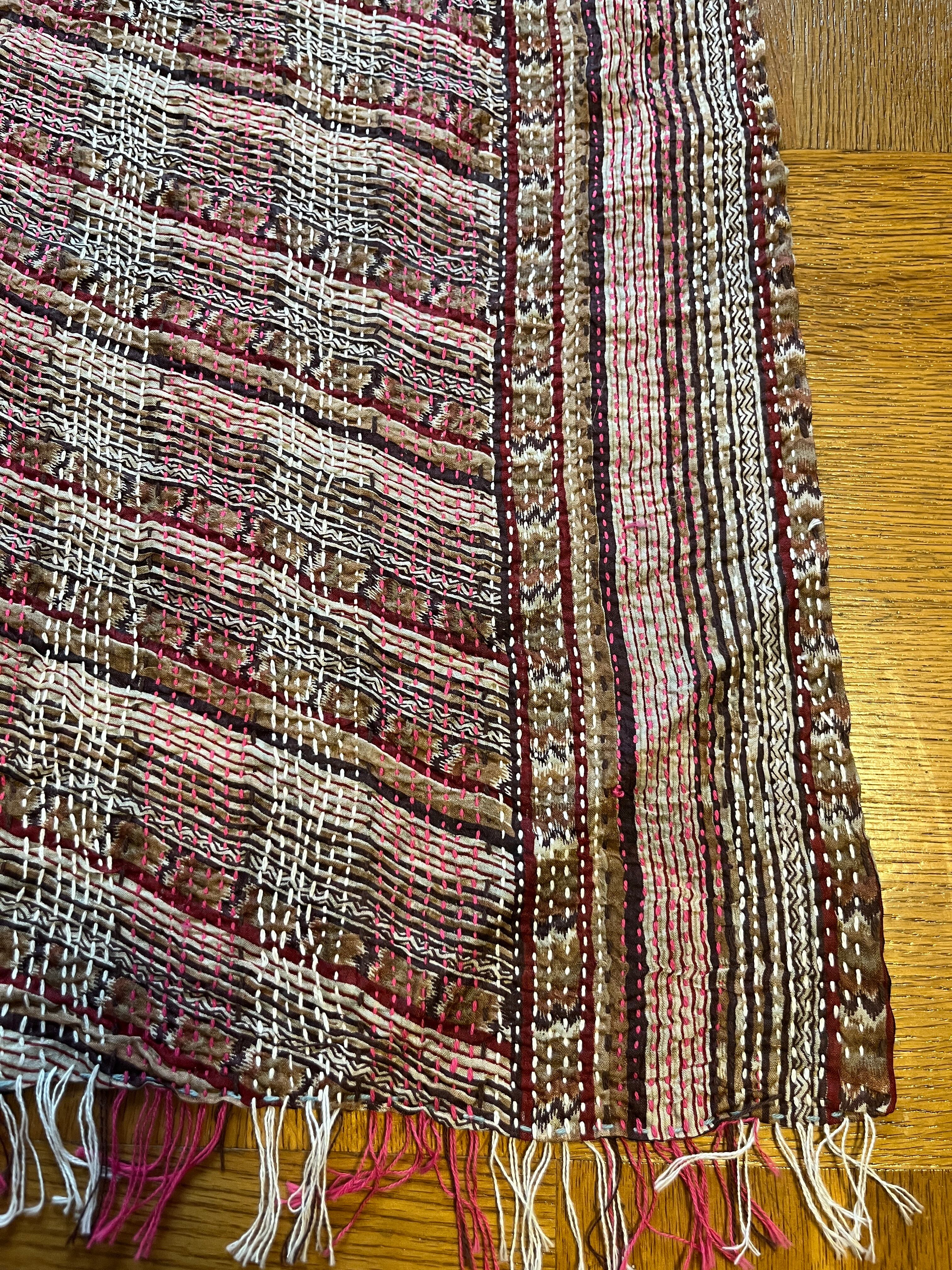オールドサリーならではの独特の色味と、1針1針手仕事で刺している刺繍で、大変丈夫な布となっています。ストールやマルチカバー(テーブルクロスやベッドカバーなど)以外にも、カバンやお洋服の生地としても使っていただけます。