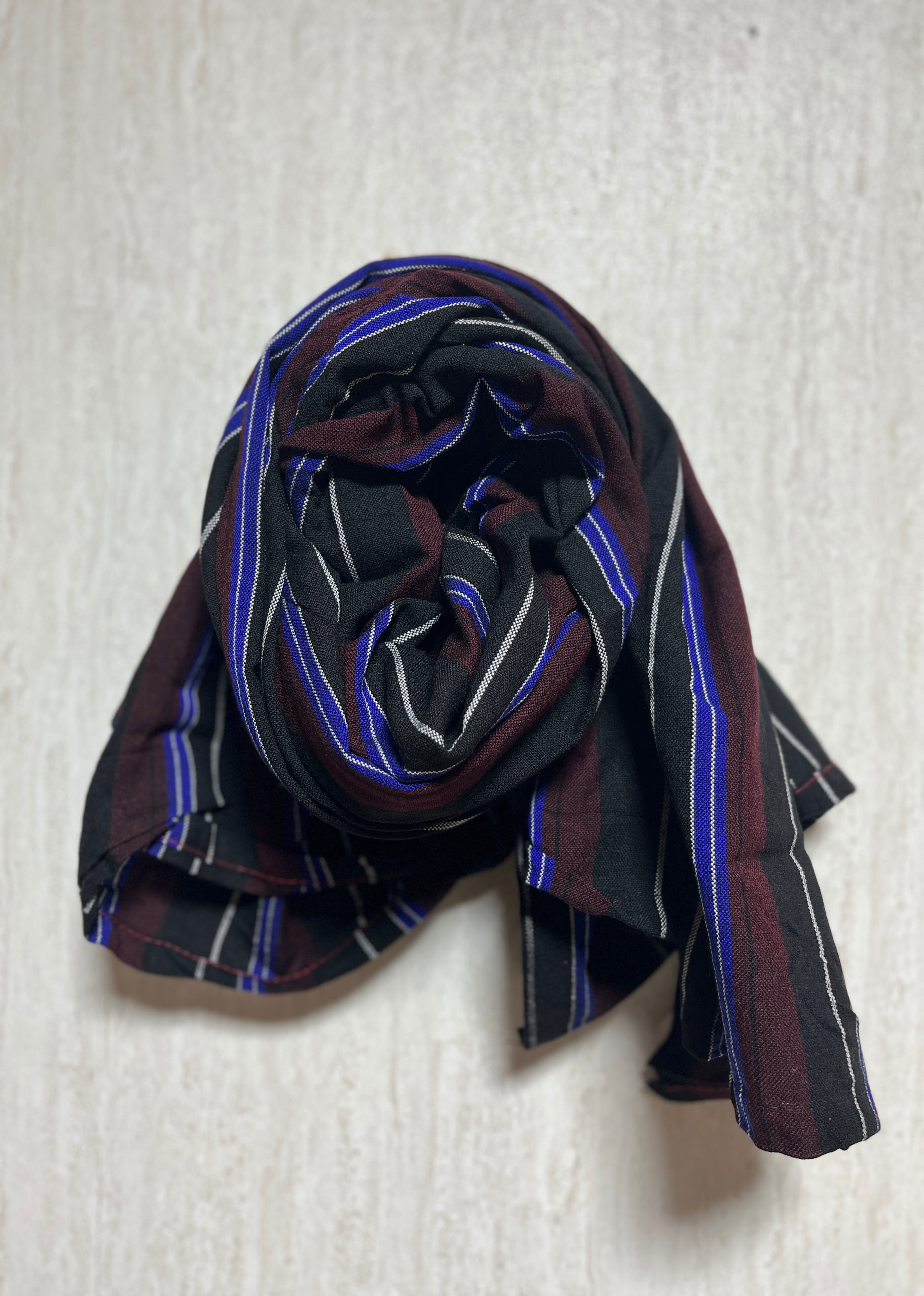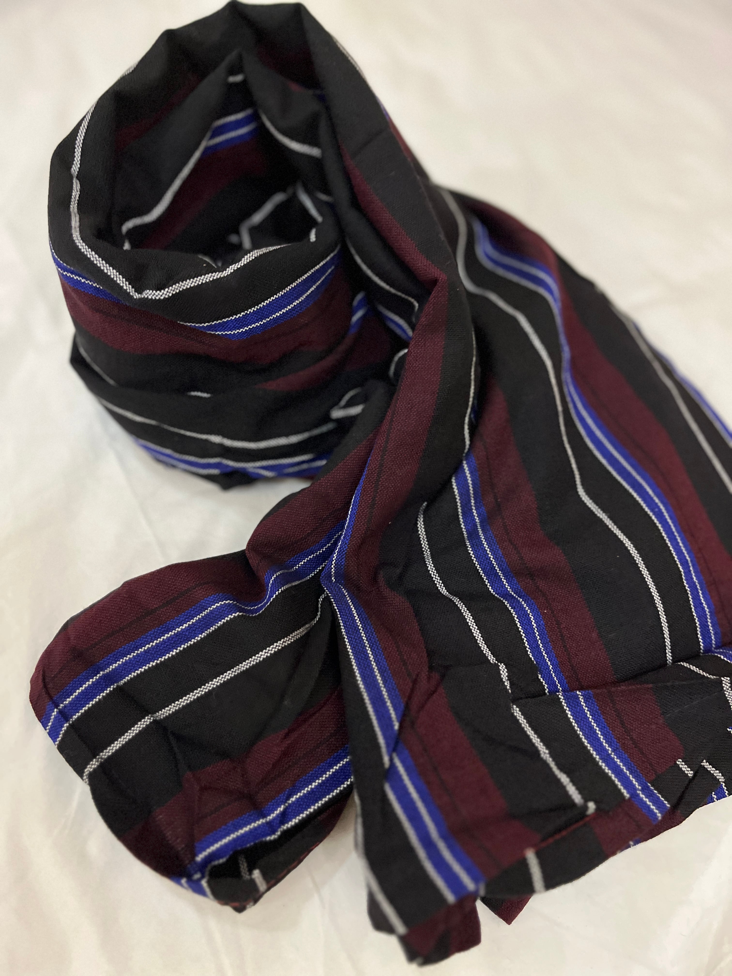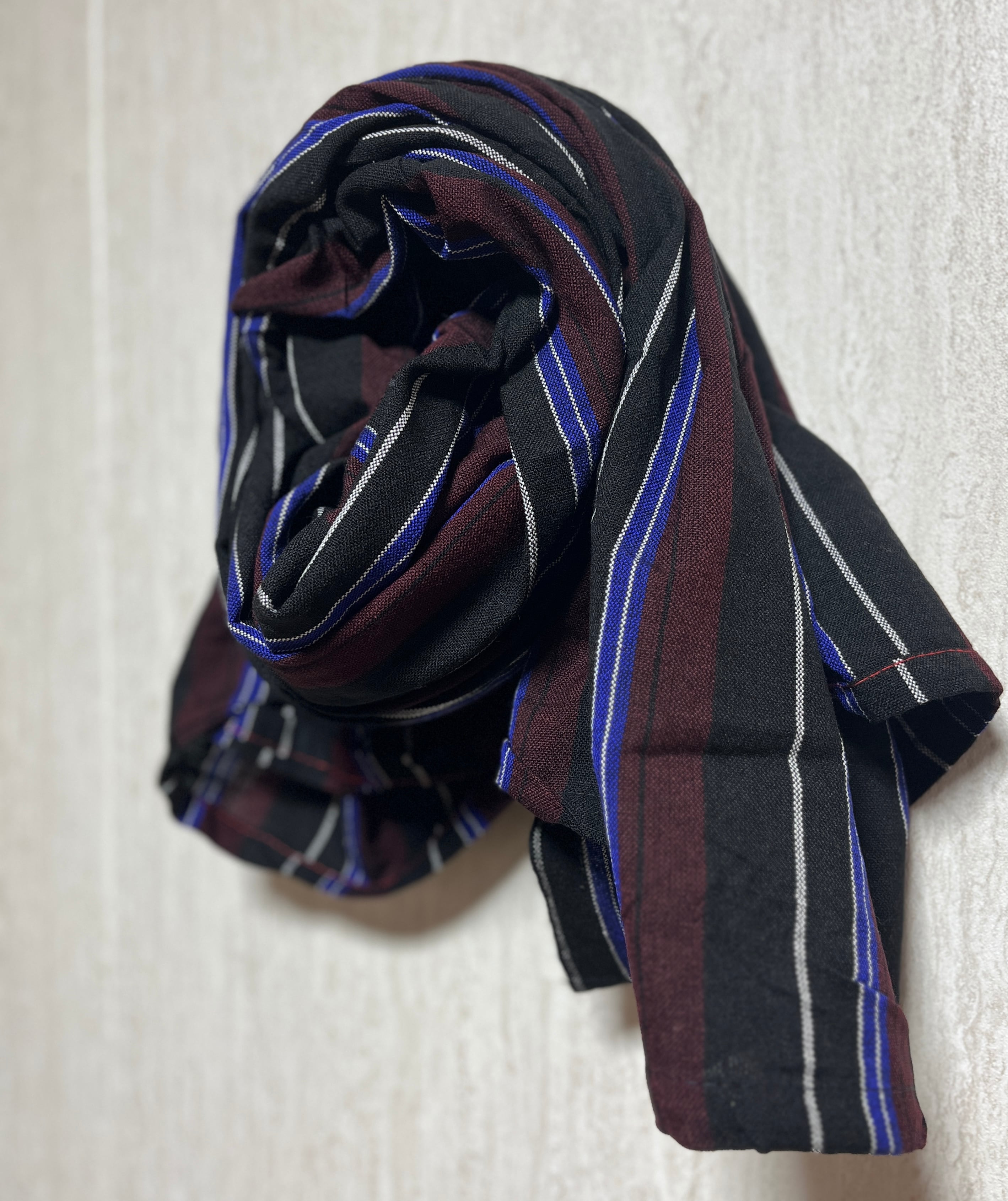 ・黒×えんじ色×白×青のストライブ柄